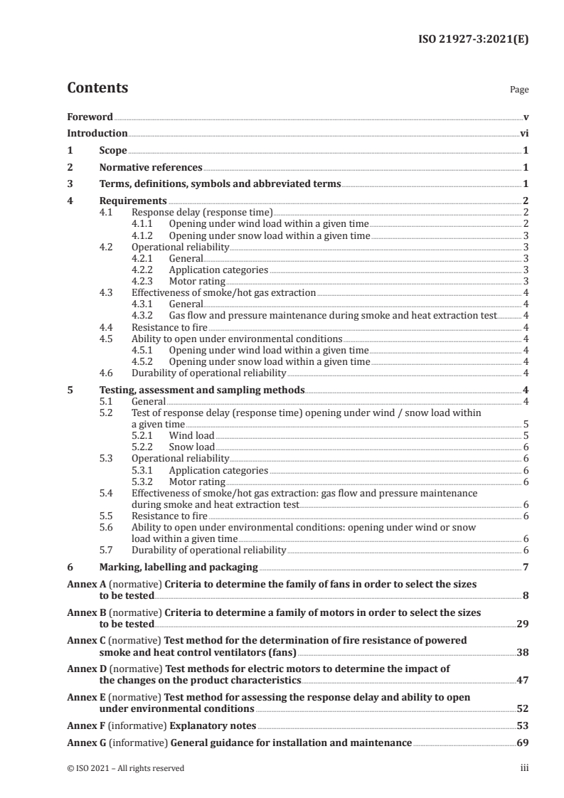 - Annexes (normative and informative): Family selection criteria for fans and motors to reduce test scope, test methods for motors, fire-resistance test methods, response-delay test methods, and guidance on installation and maintenance.