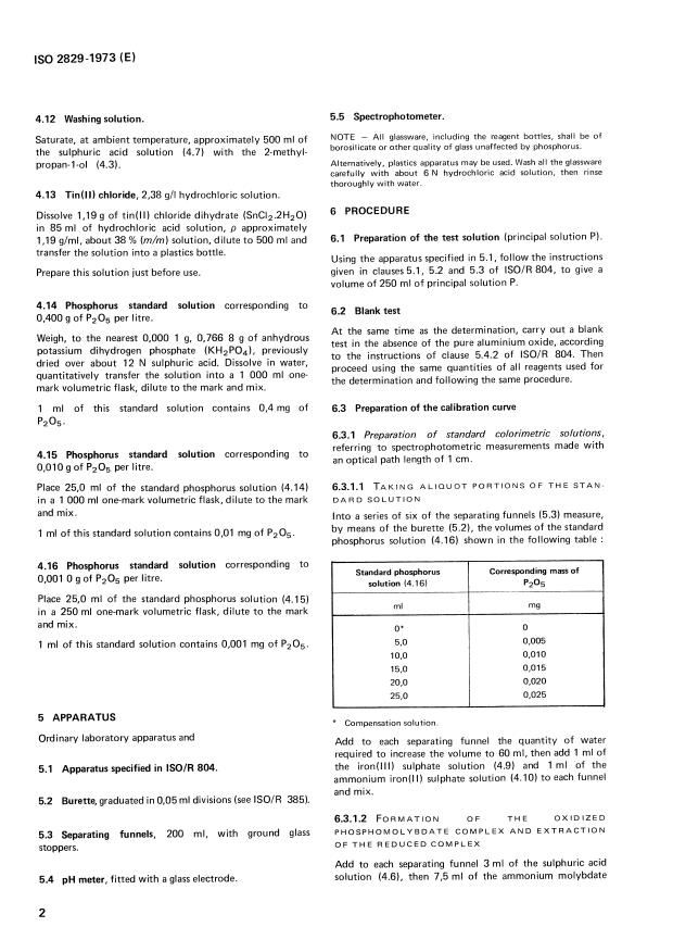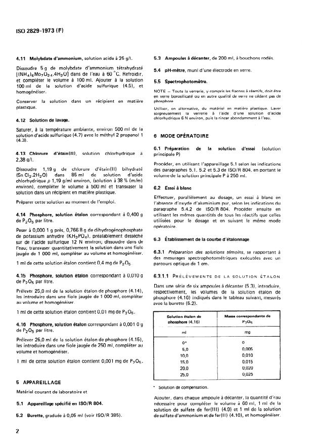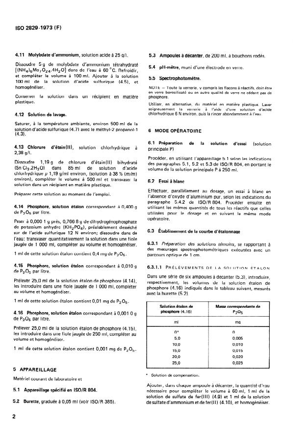 ISO 2829:1973 specifies a spectrophotometric method for the determination of phosphorus content in aluminium oxide (alumina) used for aluminium production. The method - also approved by IUPAC - is applicable to products with phosphorus contents greater than 0.0005 % (m/m). It uses alkaline fusion to prepare the sample, formation of a phosphomolybdic complex, solvent extraction, reduction to a coloured species, and spectrophotometric measurement near 730 nm.