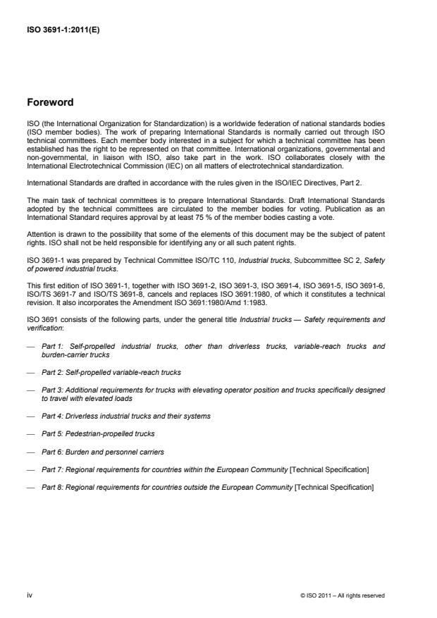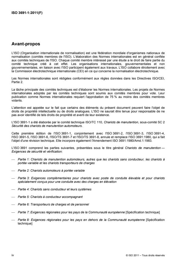 L'ISO 3691-1:2010 spécifie les exigences de sécurité et les moyens de les vérifier pour les types de chariots de manutention automoteurs suivants (présentés ci-après en tant que chariots), tels que définis dans l'ISO 5053: chariots travaillant en porte-à-faux, chariot à mât ou à fourche rétractable, chariots à fourche entre longerons, chariots à fourche recouvrante, chariot à plate-forme recouvrante élévatrice, chariots ayant une position de l'opérateur élevable jusqu'à 1 200 mm, chariots à prise latérale (un seul côté), chariots à prises latérales (des deux côtés) et chariots à prises latérales et frontales, transpalettes, chariots bidirectionnels et multidirectionnels, tracteurs pouvant tracter jusqu'à 20 000 N inclus, chariots tous terrains en porte-à-faux et chariots industriels alimentés par batterie, diesel, essence ou GPL (gaz de pétrole liquéfié).