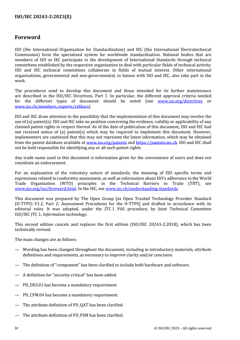 ISO/IEC 20243-2:2018 specifies the procedures to be utilized by an assessor when conducting a conformity assessment to the mandatory requirements in the Open Trusted Technology Provider? Standard (O-TTPS).1 These Assessment Procedures are intended to ensure the repeatability, reproducibility, and objectivity of assessments against the O-TTPS. Though the primary audience for this document is the assessor, an Information Technology (IT) provider who is undergoing assessment or preparing for assessment, may also find this document useful.