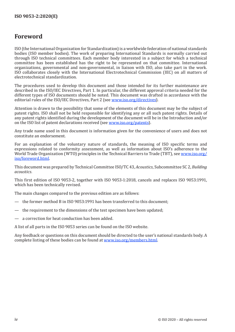 ISO 9053-2:2020 is a standard published by the International Organization for Standardization (ISO). Its full title is "Acoustics - Determination of airflow resistance - Part 2: Alternating airflow method". This standard covers: This document specifies an alternating airflow method for the determination of the airflow resistance[5], [6] of porous materials for acoustical applications. Determination of the airflow resistance based on static flow is described in ISO 9053‑1.
