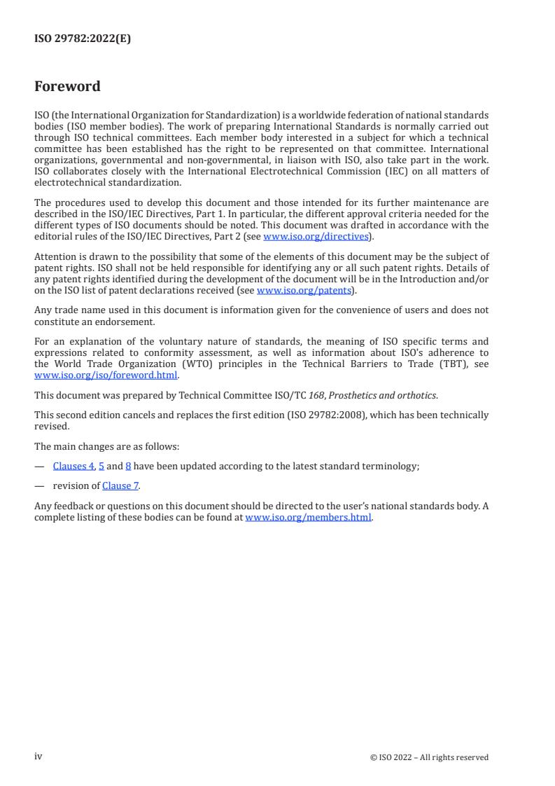 ISO 29782:2022 is a standard published by the International Organization for Standardization (ISO). Its full title is "Prostheses and orthoses - Factors to be considered when specifying a prosthesis for a person who has had a lower limb amputation". This standard covers: This document lists factors to be considered when specifying a prosthesis for a person who has had a lower limb amputation.