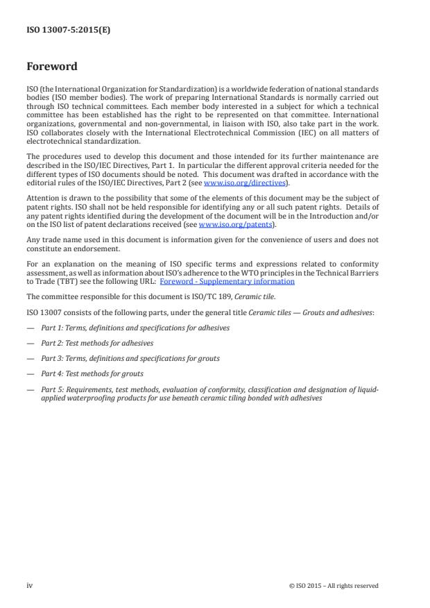 ISO 13007-5:2015 gives terminology concerning the products, and specifies test methods (see Annex A) and values of performance requirements, for liquid-applied waterproofing products associated with tile adhesives. It specifies the evaluation of conformity and the classification and designation of liquid-applied waterproofing products beneath ceramic tiling. It is applicable to all liquid-applied waterproofing membranes ? including polymer modified cementitious coatings, dispersions and reaction resin coatings ? used beneath ceramic tiling for internal and external tile installations on walls and floors. NOTE Liquid-applied waterproofing products can also be used beneath other types of tiles (natural and agglomerated stones, etc.), as long as an adverse reaction does not occur between the membrane and the alternative tile.