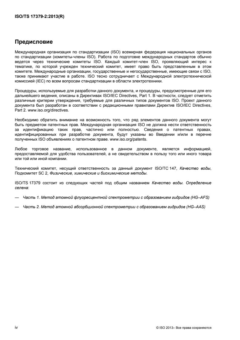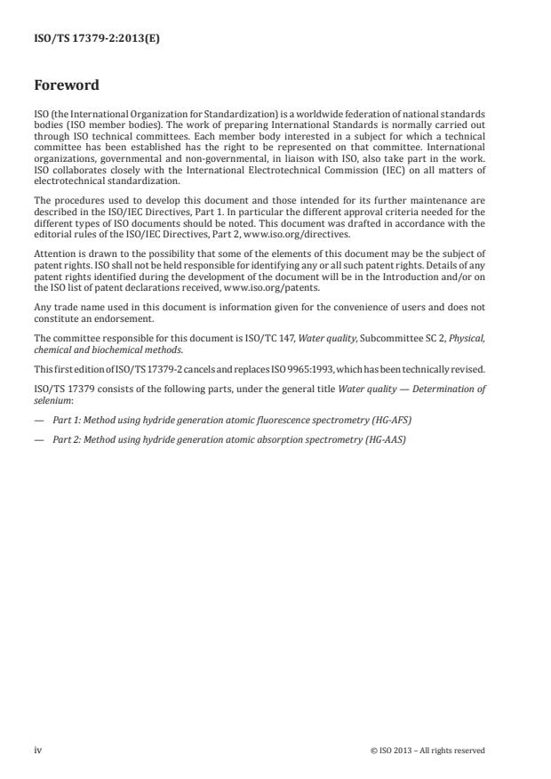 Ta del standarda ISO/TS 17379 določa metodo za določanje selena. Metoda se uporablja za pitno in površinsko vodo, podtalnico in deževnico. Dinamični razpon tega dela standarda ISO/TS 17379 je približno 0,5 μg/l do 20 μg/l. Vzorce z višjimi koncentracijami selena od obsega uporabe je mogoče testirati po ustreznem redčenju. Zaznavanje organskih spojin selena s to metodo je malo verjetno.