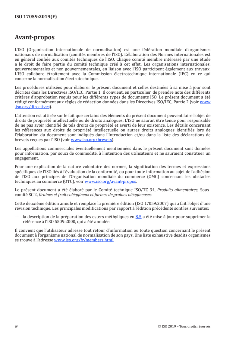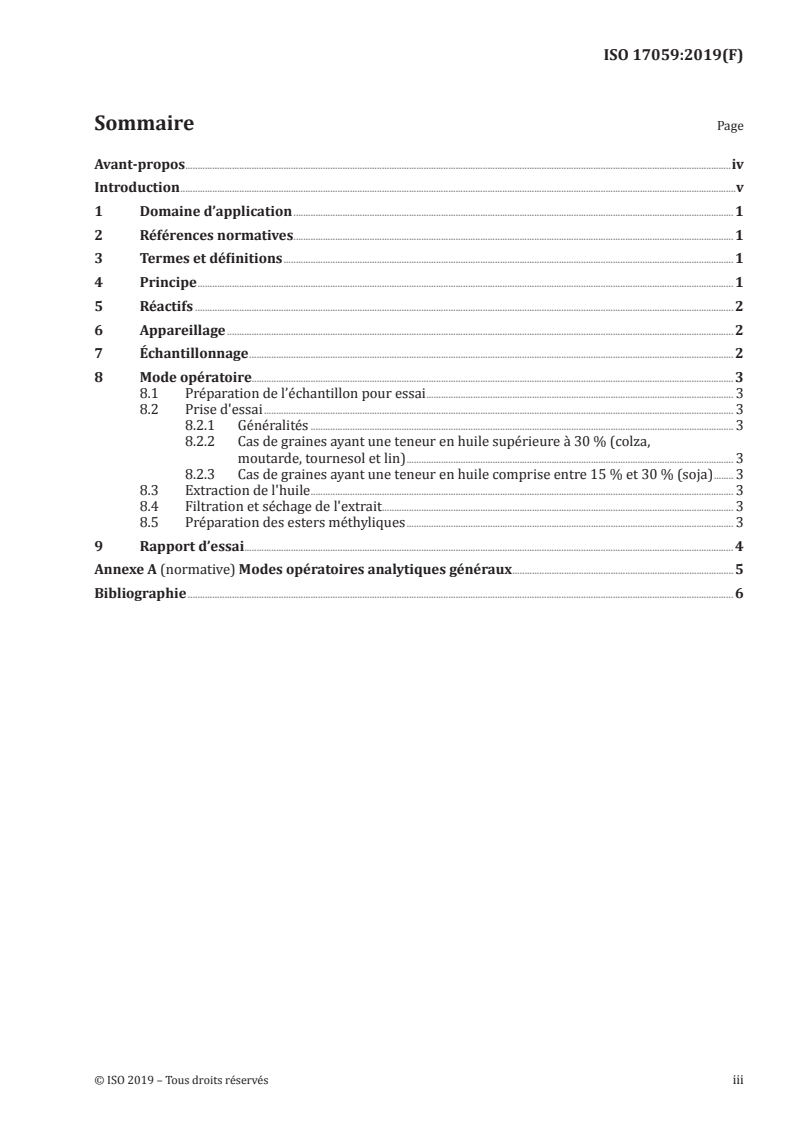 ISO 17059:2019 - Graines oléagineuses — Extraction de l'huile et préparation des esters méthyliques d'acides gras de triglycérides pour analyse par chromatographie en phase gazeuse (méthode rapide)/23/2019