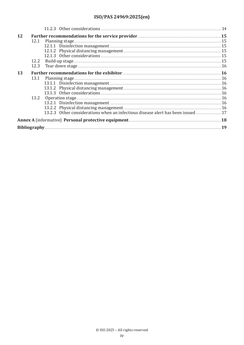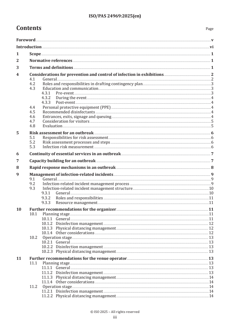 ISO/PAS 24969:2025 is a technical specification published by the International Organization for Standardization (ISO). Its full title is "Tourism and related services - Guidance on a contingency plan for infection prevention and control (IPC) in the exhibition industry". This standard covers: This document specifies a contingency plan with a set of actions and protocols, associated with infection prevention and control (IPC), to be implemented in response to any infectious disease outbreak, applicable during the entire cycle of an exhibition, i.e. its planning, operating and evaluating stages. The contingency plan in this document focuses on the following elements: risk assessment, surveillance and early detection, continuity of essential services, capacity building and rapid response mechanism. The contingency plan describes recommendations for organizers, venue operators, service providers, exhibitors and participants in terms of their roles and responsibilities at each stage of the exhibition during an infectious disease outbreak.