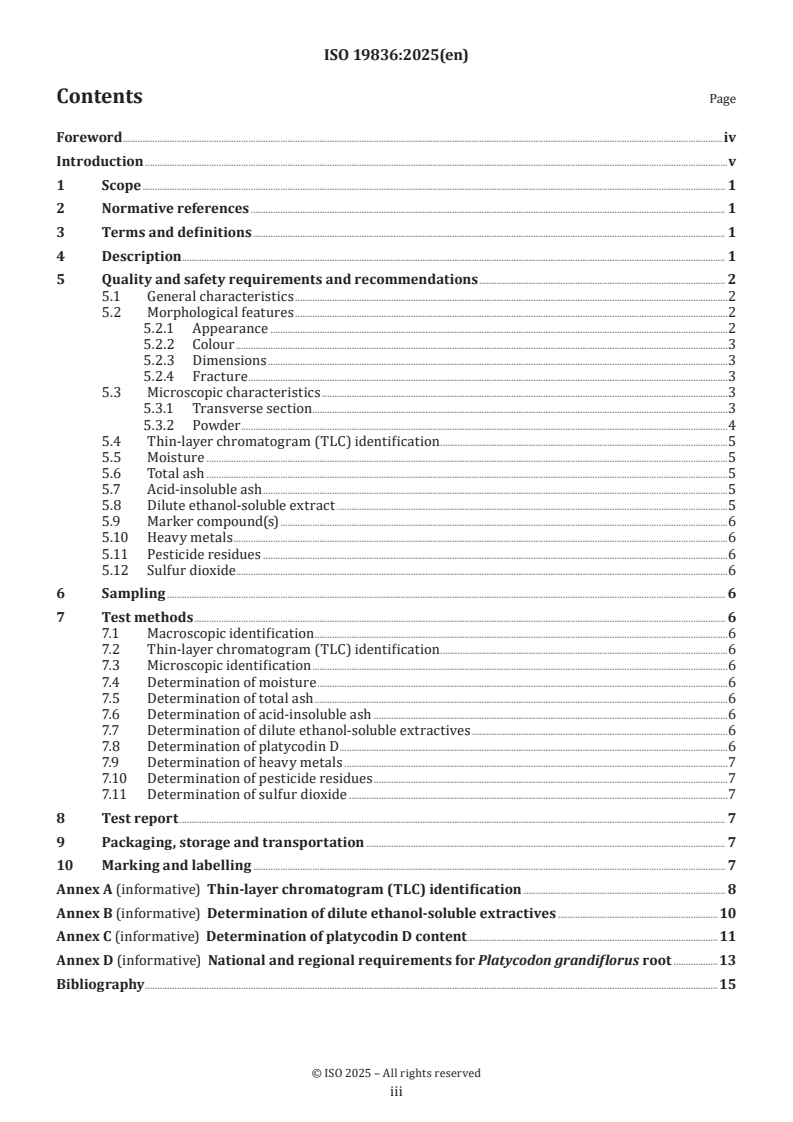 - Specific test procedures for moisture, ash, extractives, platycodin D and contaminants (including referenced ISO methods).