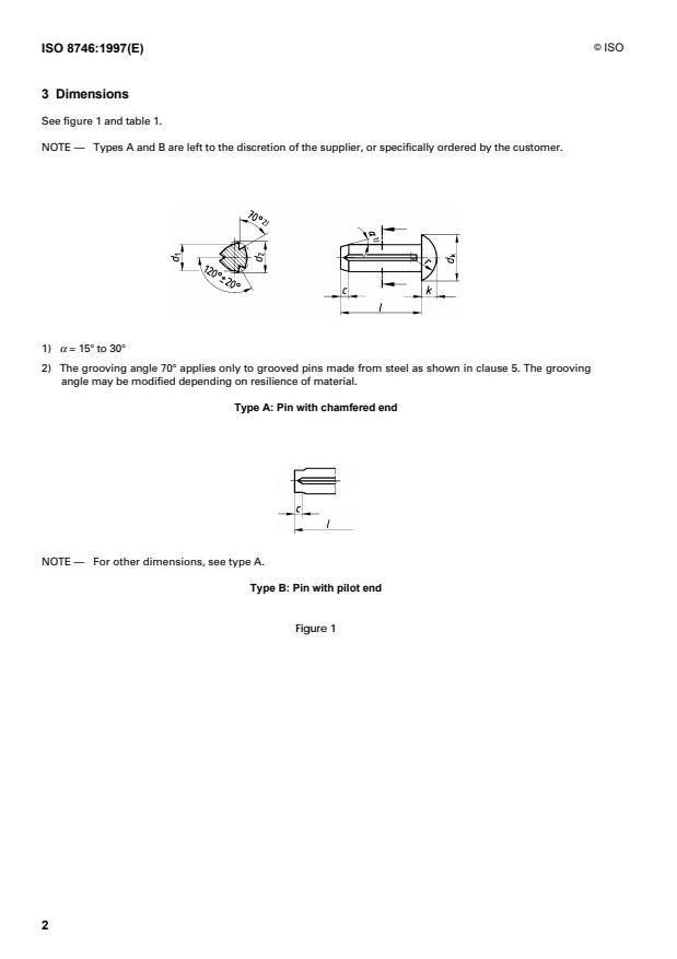 ISO 8746:1997 specifies the characteristics of round-head grooved pins used as fasteners. These pins have three equally spaced longitudinal grooves and nominal diameters from 1.4 mm to 20 mm inclusive. The displaced material at the grooves forms an expanded diameter larger than the nominal diameter, producing a non-positive locking fit when the pin is driven into a hole of nominal diameter (tolerance class H11).