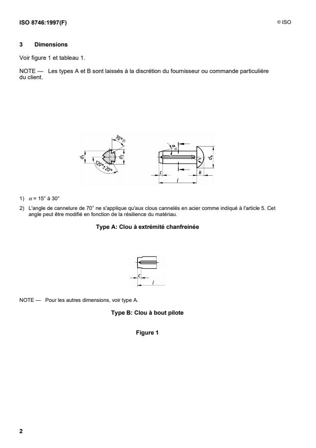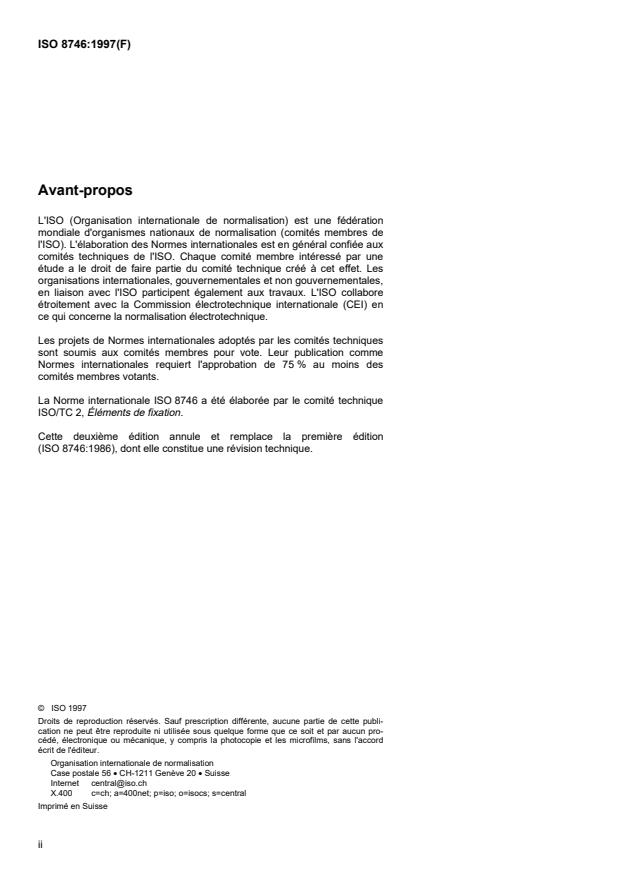 ISO 8746:1997 is a standard published by the International Organization for Standardization (ISO). Its full title is "Grooved pins with round head". This standard covers: La présente Norme internationale prescrit les caractéristiques des clous cannelés à tête ronde, à trois cannelures constantes sur toute leur longueur, débouchantes d'un côté et régulièrement espacées, de diamètre nominal, d1, de 1,4 mm à 20 mm inclus. Le matériau refoulé de chaque côté des cannelures forme un renflement dont le diamètre d2, supérieur au diamètre nominal d1, permet un ajustement serré de ces clous cannelés lorsqu'ils sont emmanchés en force dans un trou de diamètre de perçage égal au diamètre nominal du clou d1 (voir article 4).