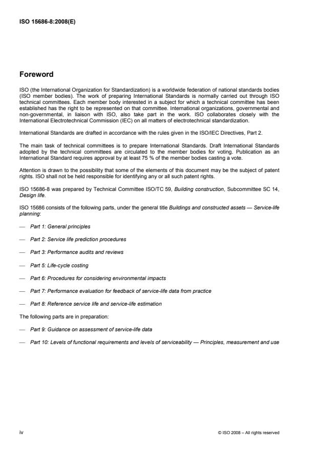 ISO 15686-8:2008 is a standard published by the International Organization for Standardization (ISO). Its full title is "Buildings and constructed assets - Service-life planning - Part 8: Reference service life and service-life estimation". This standard covers: ISO 15686-8:2008 provides guidance on the provision, selection and formatting of reference service-life data and on the application of these data for the purposes of calculating estimated service life using the factor method. ISO 15686-8:2008 does not give guidance on how to estimate the modification part or the values of factors A to G, using given reference in-use conditions and the object-specific in-use conditions.