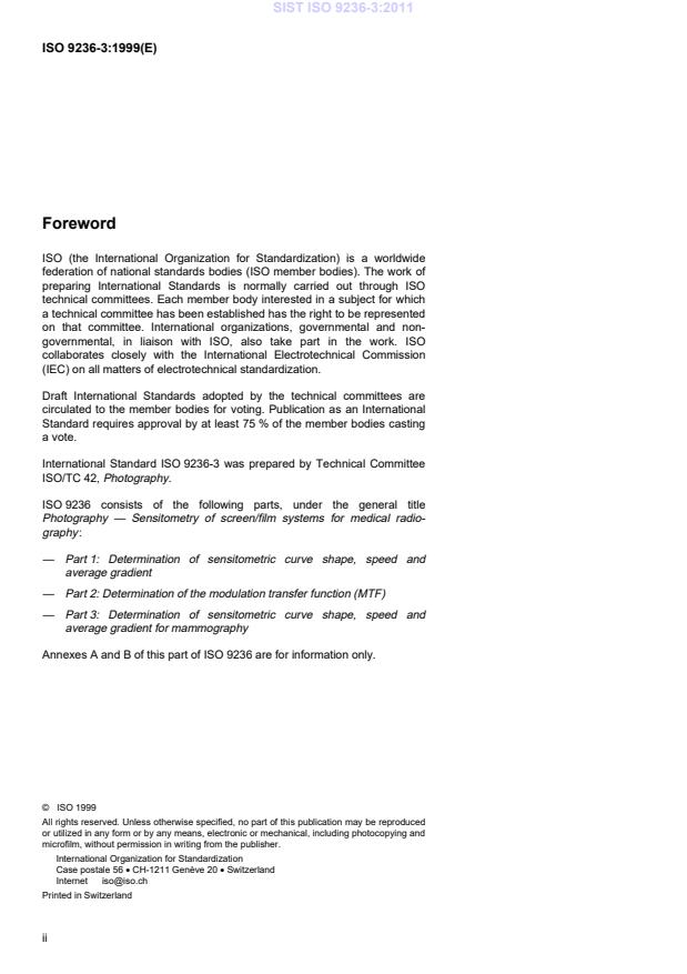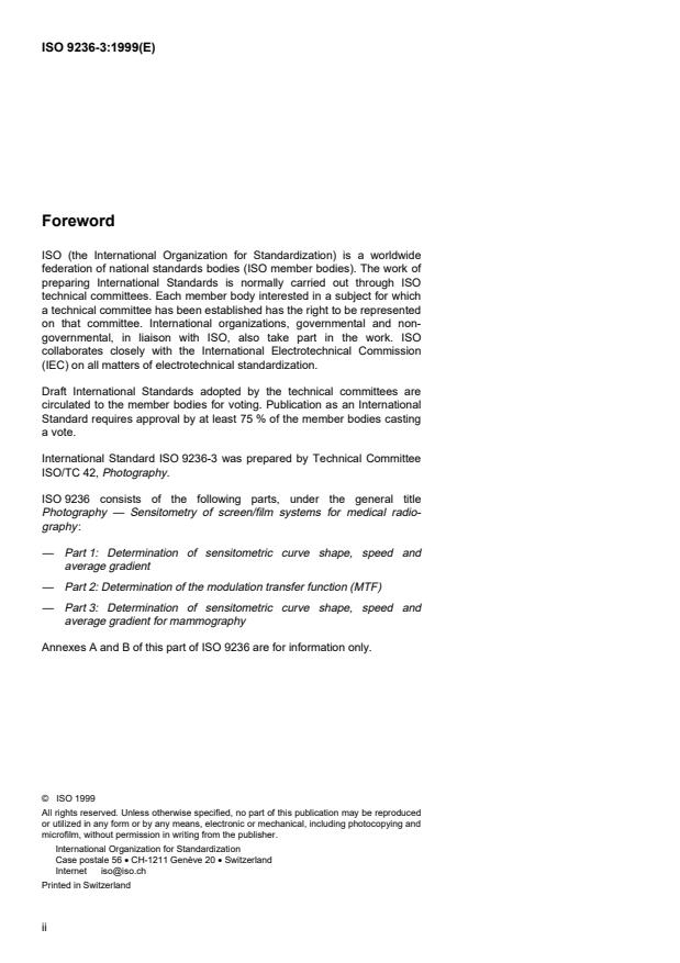 ISO 9236-3:1999 is a standard published by the International Organization for Standardization (ISO). Its full title is "Photography - Sensitometry of screen/film systems for medical radiography - Part 3: Determination of sensitometric curve shape, speed and average gradient for mammography". This standard covers: This part of ISO 9236 specifies methods for determination of the sensitometric curve shape, average gradient and speed of a single sample of a screen/film/filmholder/processing system in mammography. The filmholder may be any means which ensures close screen/film contact and prevents the film from being exposed to ambient light. In particular, the filmholder may be a light-tight vacuum bag, as often used in the laboratory, or a radiographic cassette as used in mammography. NOTE - Hereafter, screen/film/filmholder combinations will be referred to as "combinations", and will be referred to as "systems" when the processing is included.