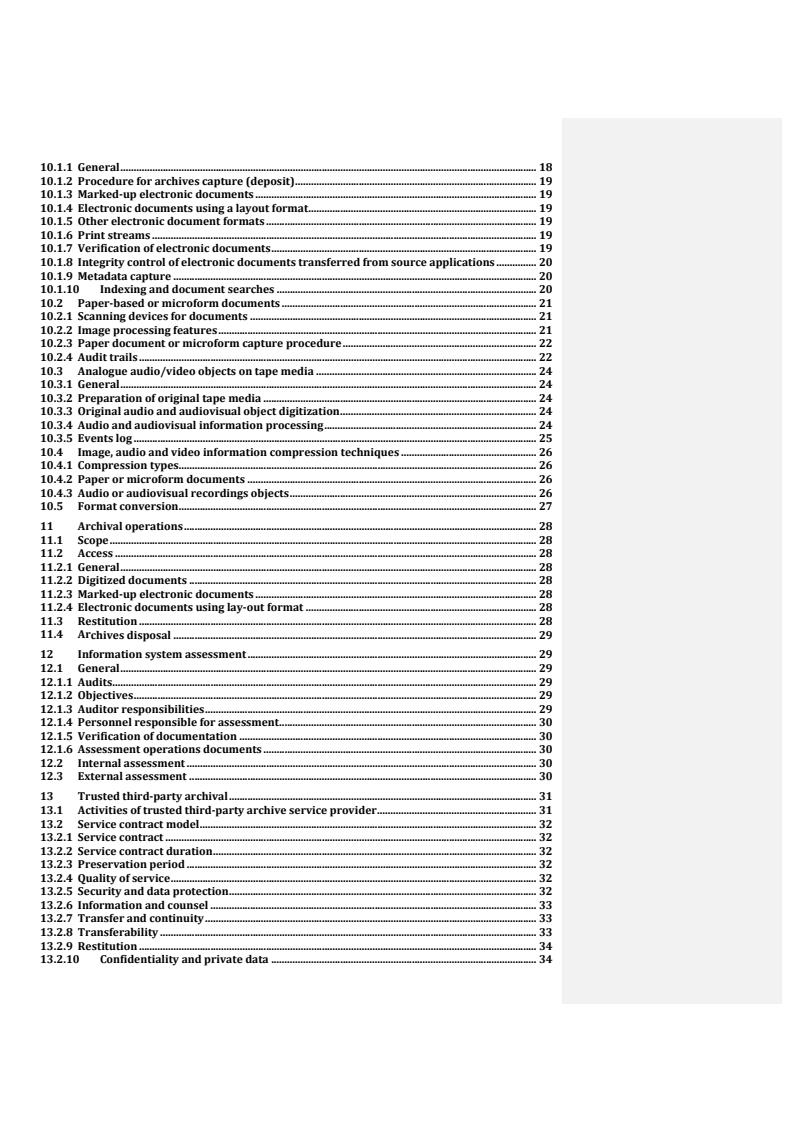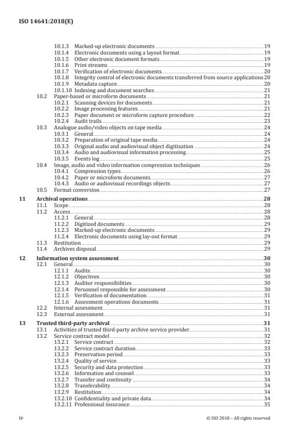 ISO 14641:2018 is a standard published by the International Organization for Standardization (ISO). Its full title is "Electronic document management - Design and operation of an information system for the preservation of electronic documents - Specifications". This standard covers: This document specifies a set of technical specifications and organizational policies to be implemented for the capture, storage and access of electronic documents. This ensures legibility, integrity and traceability of the documents for the duration of their preservation. This document is applicable to electronic documents resulting from: - the scanning of original paper or microform documents; - the conversion of analogue audio or video content; - the "native" creation by an information system application; - other sources that create digital content such as two- or three- dimensional maps, drawings or designs, digital audio/video and digital medical images. This document is not applicable to information systems in which users have the ability to substitute or alter documents after capture. This document is intended for the following users. a) Organizations implementing information systems in which: electronic documents created from scan captures are kept in an environment that ensures fidelity with regard to the original and long-term preservation; digitally born documents are kept in an environment that ensures the content integrity of the information and document legibility; traceability is ensured for all operations relating to the electronic documents. b) Organizations providing information technology services and software publishers seeking to develop information systems that ensure the fidelity and integrity of electronic documents. c) Organizations providing third-party document archiving services.