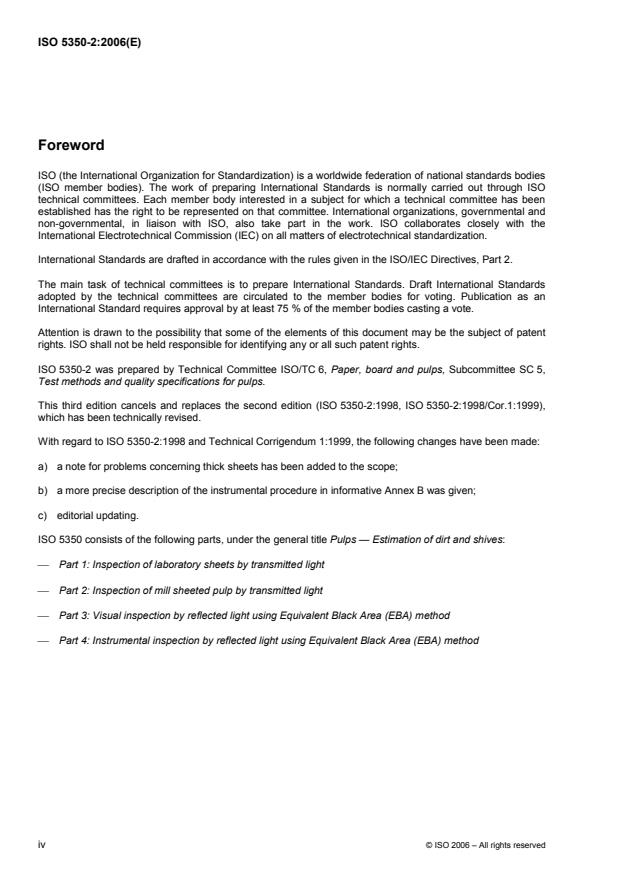 ISO 5350-2:2006 is a standard published by the International Organization for Standardization (ISO). Its full title is "Pulps - Estimation of dirt and shives - Part 2: Inspection of mill sheeted pulp by transmitted light". This standard covers: ISO 5350-2:2006 specifies a method for the estimation by transmitted light of the visible dirt and shives in pulp manufactured in sheets. It does not apply to unbleached kraft pulps or to any other sheeted pulps that are too opaque to allow for the estimation of the minimum size or for minimum contrast specks to be counted, in accordance with ISO 5350-2:2006. The maximum grammage for most pulp sheets is in the range 800 g/m2 to 1 000 g/m2. If the sheets of the mill sheeted pulp have high grammage or are very opaque for other reasons, ISO 5350-1:2006 should be applied. ISO 5350-2:2006 is not intended for recycled pulp.