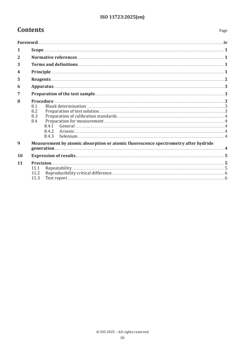 ISO 11723:2025 is a standard published by the International Organization for Standardization (ISO). Its full title is "Coal and coke - Determination of arsenic and selenium - Eschka's mixture and hydride generation method". This standard covers: This document specifies a method using Eschka's mixture during ashing, extraction of the ash residue with acid, and hydride generation atomic absorption spectrometry or hydride generation atomic fluorescence spectrometry, for the determination of arsenic and selenium in solid mineral fuels. The method is also applicable for the determination of the analytes by hydride generation inductively coupled plasma atomic emission spectrometry.