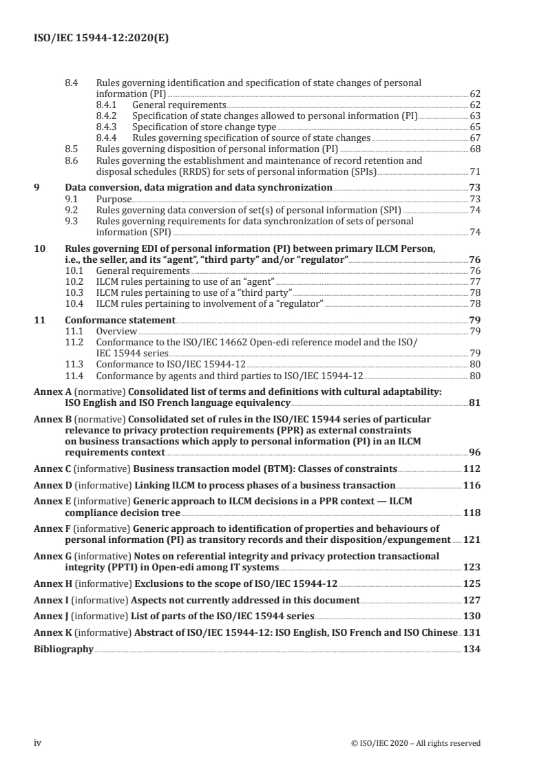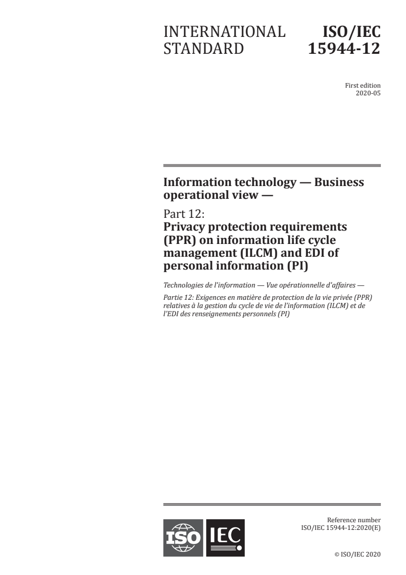 ISO/IEC 15944-12:2020 is a standard published by the International Organization for Standardization (ISO). Its full title is "Information technology - Business operational view - Part 12: Privacy protection requirements (PPR) on information life cycle management (ILCM) and EDI of personal information (PI)". This standard covers: This document: - provides method(s) for identifying, in Open-edi modelling technologies and development of scenarios, the additional requirements in business operational view (BOV) specifications for identifying the additional external constraints to be applied to recorded information in business transactions relating to personal information of an individual, as required by legal and regulatory requirements of applicable jurisdictional domains; - integrates existing normative elements in support of privacy and data protection requirements as are already identified in ISO/IEC 14662 and ISO/IEC 15944-1, ISO/IEC 15944-2, ISO/IEC 15944-4, ISO/IEC 15944-5, ISO/IEC 15944-8, ISO/IEC 15944-9, and ISO/IEC 15944-10; - provides overarching, operational ?best practice' statements for associated (and not necessarily automated) processes, procedures, practices and governance requirements that act in support of implementing and enforcing technical mechanisms which support the privacy/data protection requirements necessary for implementation in Open-edi transaction environments; - focuses on the life cycle management of personal information i.e., the contents of SPIs (and their SRIs) related to the business transaction interchanged via EDI as information bundles and their associated semantic components among the parties to a business transaction. NOTE Privacy protection requirements (PPR) on information life cycle management (ILCM) and EDI of personal information as stated in this document serve as a minimum set of ILCM policy and operational requirements for all recorded information pertaining to a business transaction in particular, as well as ILCM implementation in any organization in general. This document does not specify the technical mechanisms, i.e., functional support services (FSV) which are required to support BOV-identified requirements. Detailed exclusions to the scope of this document are provided in Annex H.