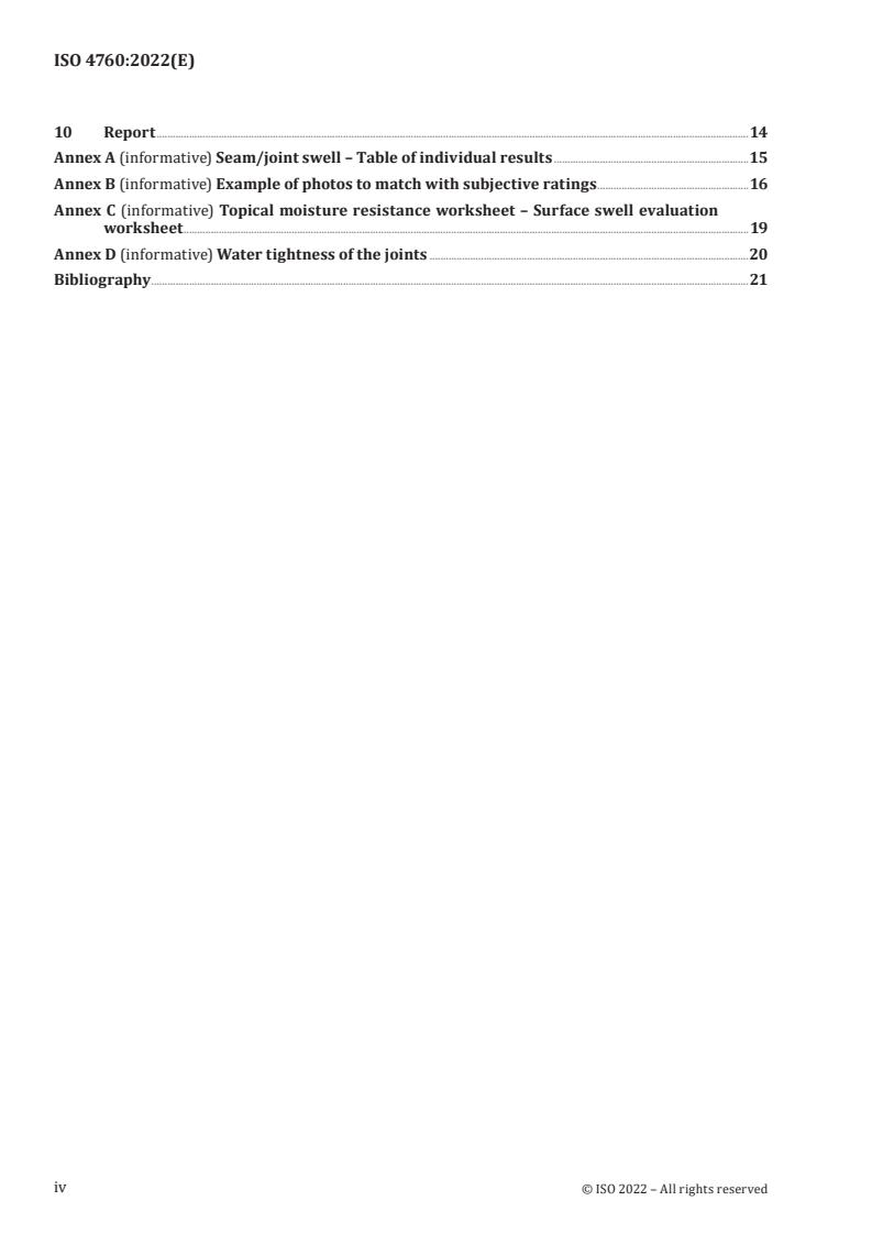 - Prepared by ISO/TC 219 (Floor coverings). The document contains informative annexes (worksheets, photo examples, joint water tightness guidance) and references prior industry methods (e.g., NALFA surface water guidance). ISO 4760:2022 includes no normative references and provides statistical precision/bias guidance for interlaboratory studies.