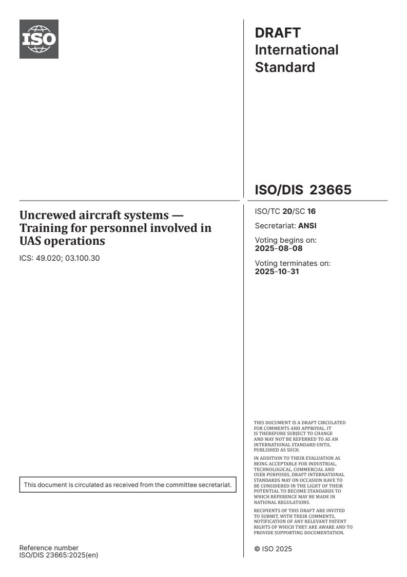 ISO/FDIS 23665 - Uncrewed aircraft systems — Training for personnel involved in UAS operations/13/2025