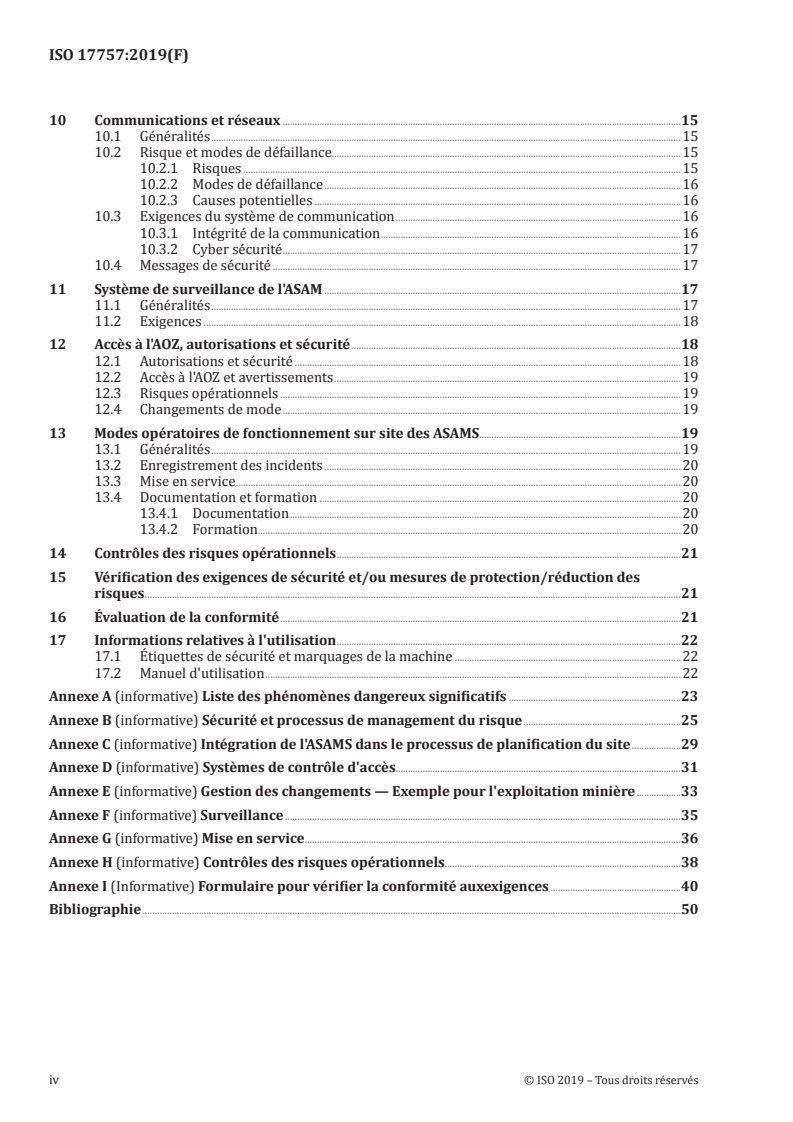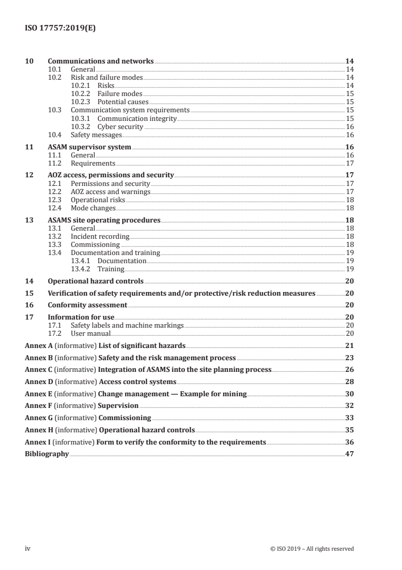 The standard also includes informative annexes on hazards, risk management, site planning, access control, change management, commissioning and conformity verification.
