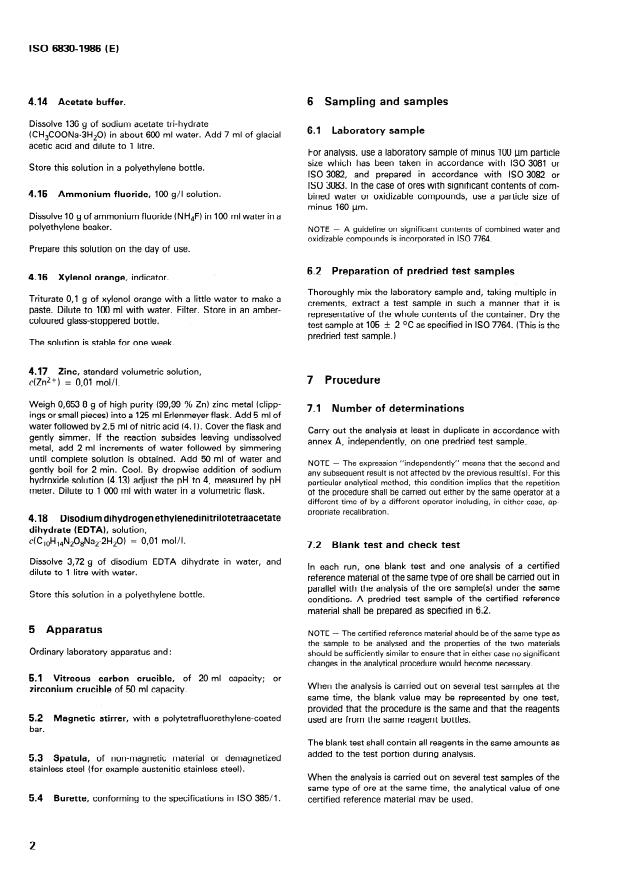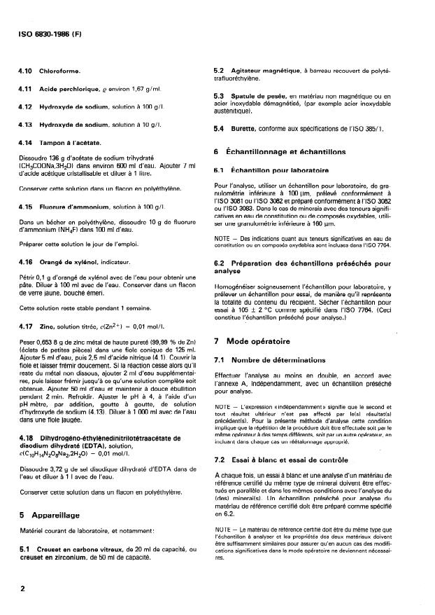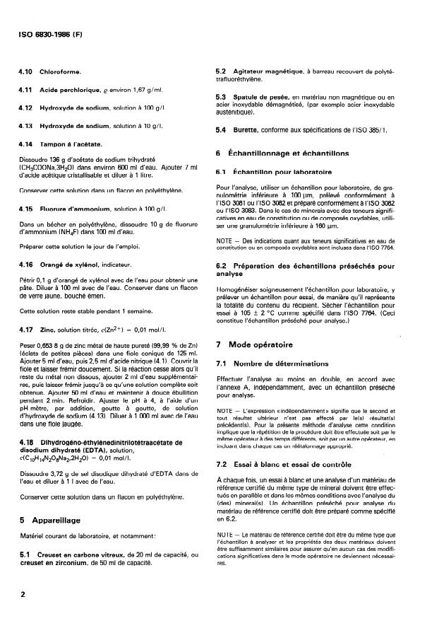 - Reagents and apparatus: lists of required reagents (EDTA, cupferron, chloroform, perchloric/nitric/hydrochloric acids, ammonium chloride, sodium hydroxide, acetate buffer, etc.) and common laboratory equipment including vitreous carbon or zirconium crucibles and burettes conforming to ISO specifications.