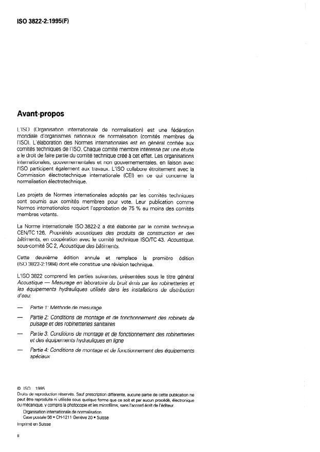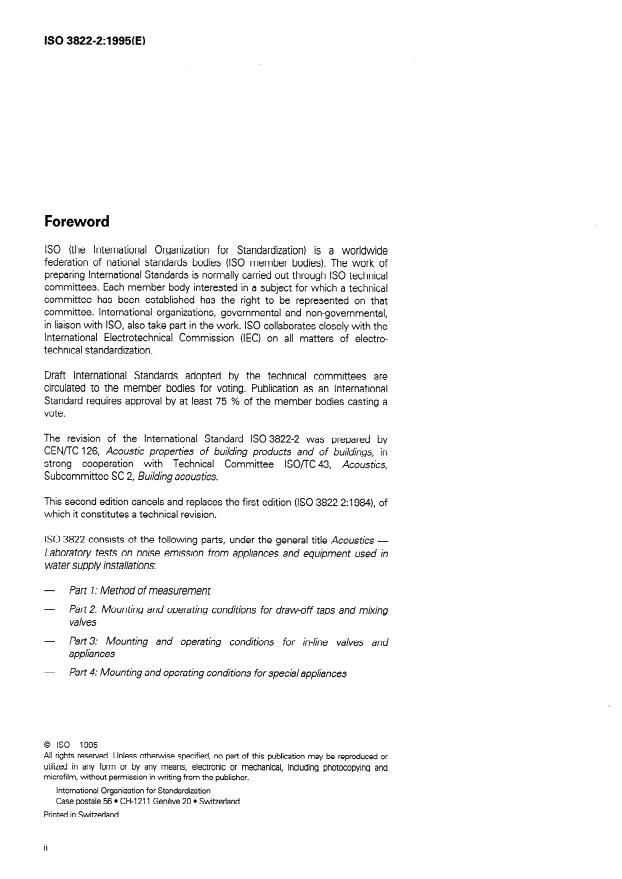 ISO 3822-2:1995 is a standard published by the International Organization for Standardization (ISO). Its full title is "Acoustics - Laboratory tests on noise emission from appliances and equipment used in water supply installations - Part 2: Mounting and operating conditions for draw-off taps and mixing valves". This standard covers: Describes the mounting and operating conditions to be used for draw-off taps and mixing valves when measuring noise emmission resulting from water flow. Replaces the first edition, which has been technically revised.