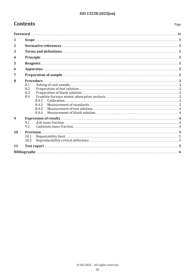 ISO 15238:2025 specifies a laboratory procedure for the determination of the total cadmium mass fraction in coal. The method combines controlled ashing of a representative coal sample with dissolution of the ash and quantification by graphite-furnace atomic absorption spectroscopy (GFAAS/AAS). This third edition updates normative references and refines calculation formulae; it is intended for routine monitoring, quality control and regulatory assessment of cadmium in coal.