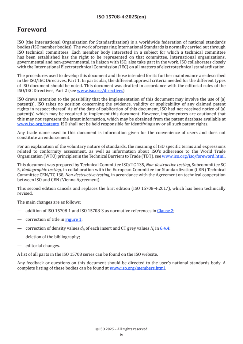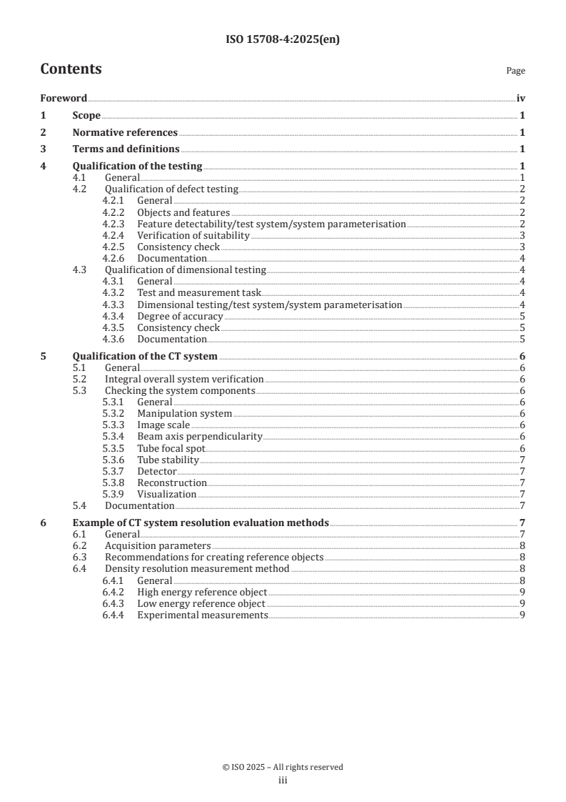 ISO 15708-4:2025 is a standard published by the International Organization for Standardization (ISO). Its full title is "Non-destructive testing - Radiation methods for computed tomography - Part 4: Qualification". This standard covers: This document gives guidance on the qualification of the performance of a computed tomography (CT) system with respect to various testing tasks. This document is applicable only to industrial imaging (i.e. non-medical applications) and provides a consistent set of definitions of CT performance parameters, including the relationship between these performance parameters and CT system specifications. This document is applicable to industrial computed tomography. This document does not apply to other techniques of tomography such as translational tomography and tomosynthesis.