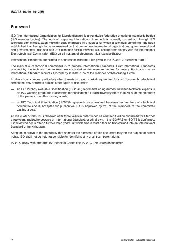 ISO/TS 10797:2012 is a technical specification published by the International Organization for Standardization (ISO). Its full title is "Nanotechnologies - Characterization of single-wall carbon nanotubes using transmission electron microscopy". This standard covers: ISO/TS 10797:2012 establishes methods for characterizing the morphology of single-wall carbon nanotubes (SWCNTs) and identifying the elemental composition of other materials in SWCNT samples, using transmission electron microscopy and chemical analysis by energy dispersive X-ray spectrometry.