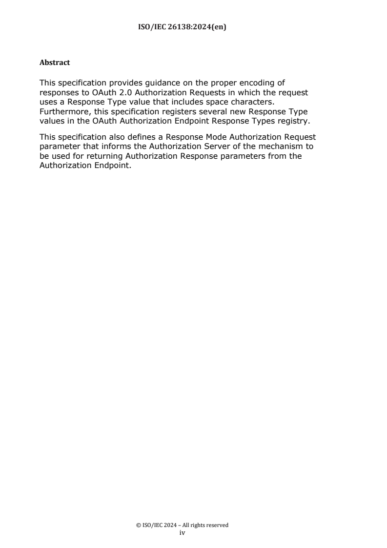 ISO/IEC 26138:2024 is a standard published by the International Organization for Standardization (ISO). Its full title is "Information technology - OpenID connect - OAuth 2.0 multiple response type encoding practices". This standard covers: This document provides guidance on the proper encoding of responses to OAuth 2.0 Authorization Requests in which the request uses a Response Type value that includes space characters. Furthermore, this document registers several new Response Type values in the OAuth Authorization Endpoint Response Types registry. This document also defines a Response Mode Authorization Request parameter that informs the Authorization Server of the mechanism to be used for returning Authorization Response parameters from the Authorization Endpoint.