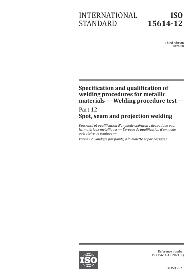 ISO 15614-12:2021 - Specification and qualification of welding procedures for metallic materials — Welding procedure test — Part 12: Spot, seam and projection welding Released:10/14/2021