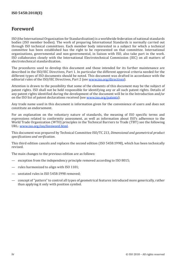 - Pattern specification concept: Defines a pattern specification as a combined requirement controlled by a set of geometrical specifications and a tolerance zone pattern (see Annex C for examples).