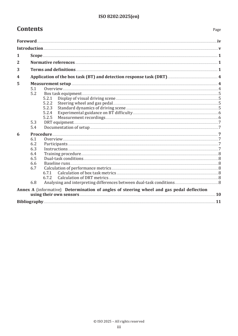 ISO 8202:2025 is a standard published by the International Organization for Standardization (ISO). Its full title is "Road vehicles - Box task and detection response task to measure visual-manual and cognitive demand". This standard covers: This document describes a dynamic dual-task method that quantitatively measures human-performance degradation on a primary driving-like task while a secondary task is being performed. The performance measures of the method indicate the visual-manual and cognitive secondary-task demand associated with visual-manual or auditory-verbal secondary task engagement while driving. This document defines key terms and parameters for the assessment of BT + DRT. It provides guidelines and minimum requirements on equipment and procedures to plan evaluation trials, specify (and install) data capture equipment, conduct a study, analyse, interpret, and report metrics indicating visual-manual and cognitive secondary-task demand using the BT + DRT. The metrics and definitions described in this document provide a common source for the assessment of visual-manual and cognitive task demand induced by different IVIS while driving. The BT + DRT is applicable to standardized experiments in laboratory-based settings. Data collection and analyses according to this document allow comparisons across different secondary tasks. In contrast, this document does not apply to the measurement of primary (driving) task demand. This document can be applied to both original equipment manufacturer (OEM) and after-market in-vehicle systems, and to permanently installed as well as portable systems.