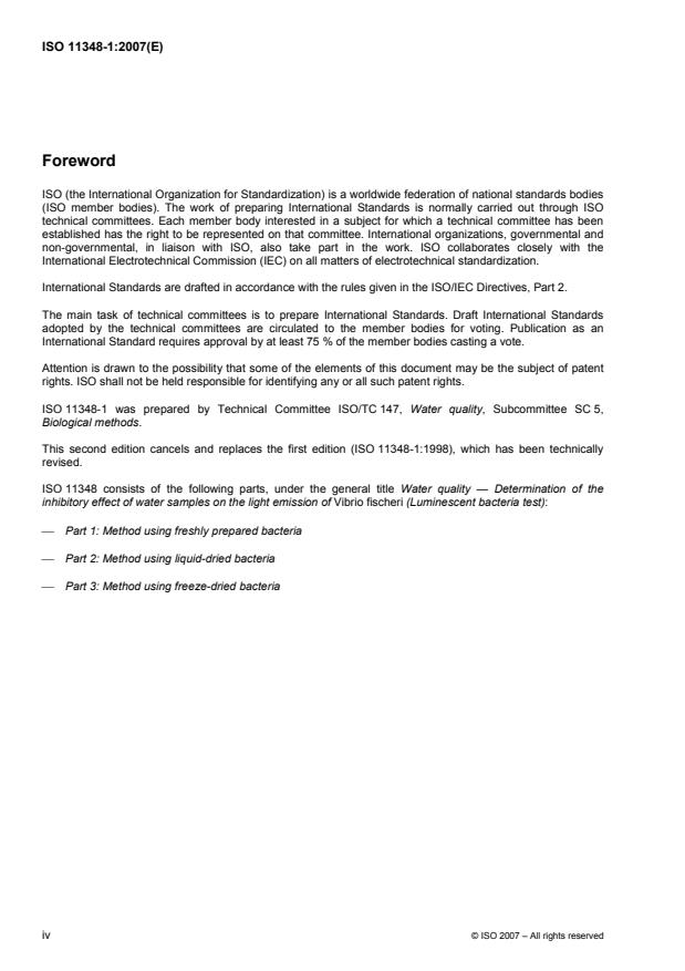 ISO 11348-1:2007 - Water quality -- Determination of the inhibitory effect of water samples on the light emission of Vibrio fischeri (Luminescent bacteria test)