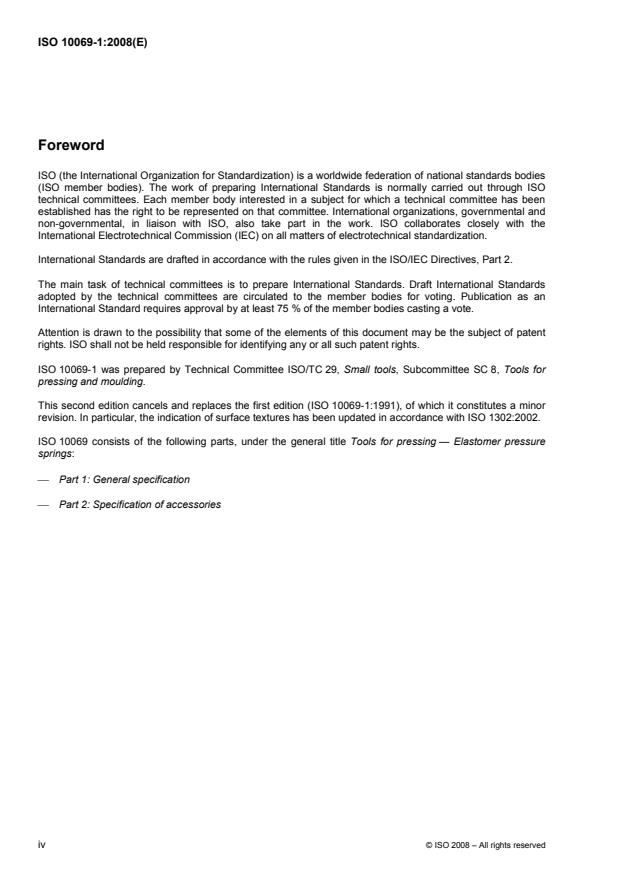 ISO 10069-1:2008 is a standard published by the International Organization for Standardization (ISO). Its full title is "Tools for pressing - Elastomer pressure springs - Part 1: General specification". This standard covers: ISO 10069-1:2008 specifies the dimensions, in millimetres, of elastomer pressure springs intended for use in press tools, and the diameters, in millimetres, of counterbores for these pressure springs. It also gives information concerning materials and their hardness, and specifies the designation of springs that are in accordance with its requirements, together with the marking of their packages. Examples of suitable applications are given in Annex A. Dimensions of accessories (spring collars and pilot pins) are specified in ISO 10069-2.