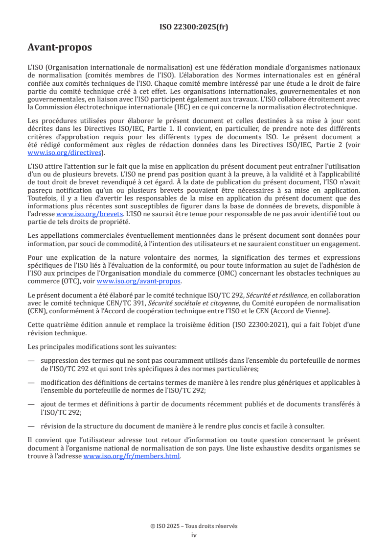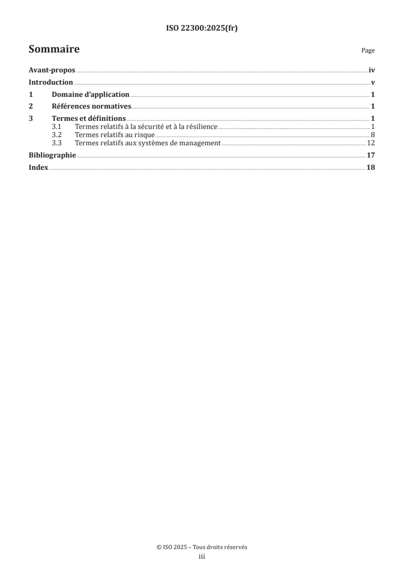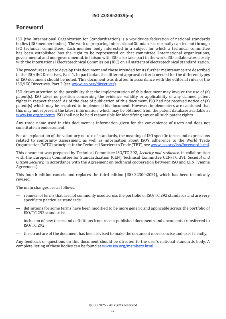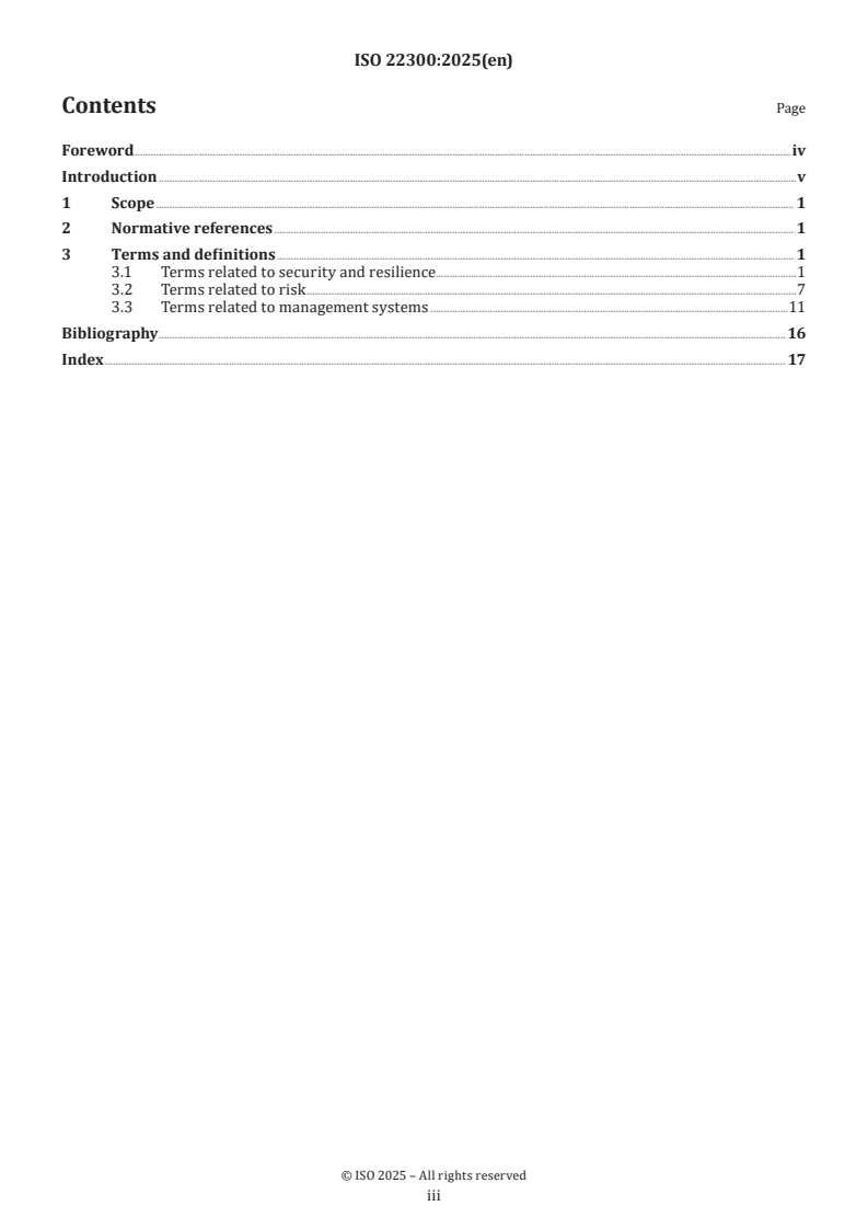 ISO 22300:2025 is the fourth edition vocabulary standard published by ISO/TC 292. It provides a harmonized set of terms and definitions for security and resilience topics to promote consistent language across standards, policies and operational documents. The document is organized into three main term groups: terms related to security and resilience, terms related to risk, and terms related to management systems.