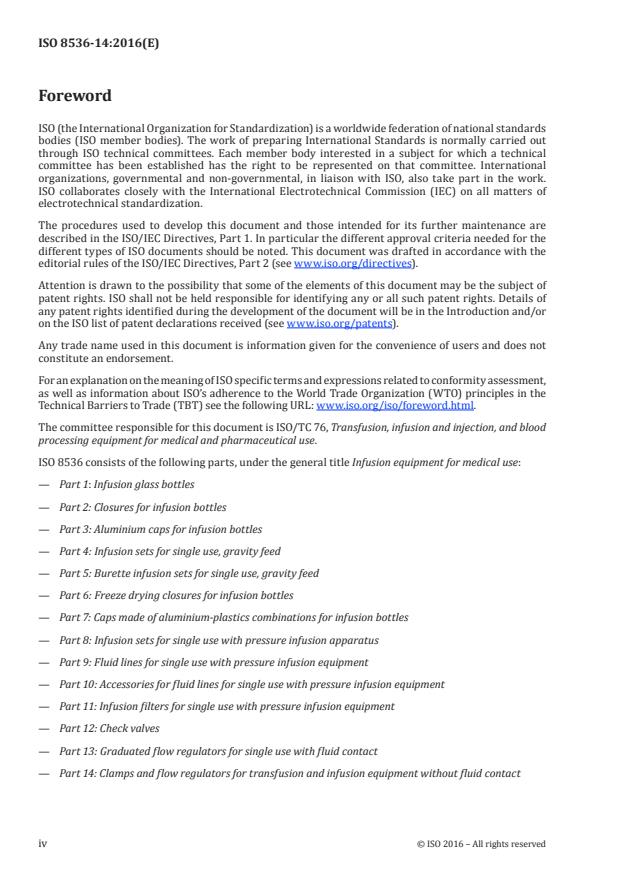 ISO 8536-14:2016 specifies requirements for non-sterile clamps and flow regulators used as a subcomponent to control the flow of intravenous solutions and/or blood components through sterilized infusion and blood transfusion sets and blood bag assemblies without fluid contact. In some countries, the national pharmacopoeia or other national regulations are legally binding and take precedence over ISO 8536-14:2016.