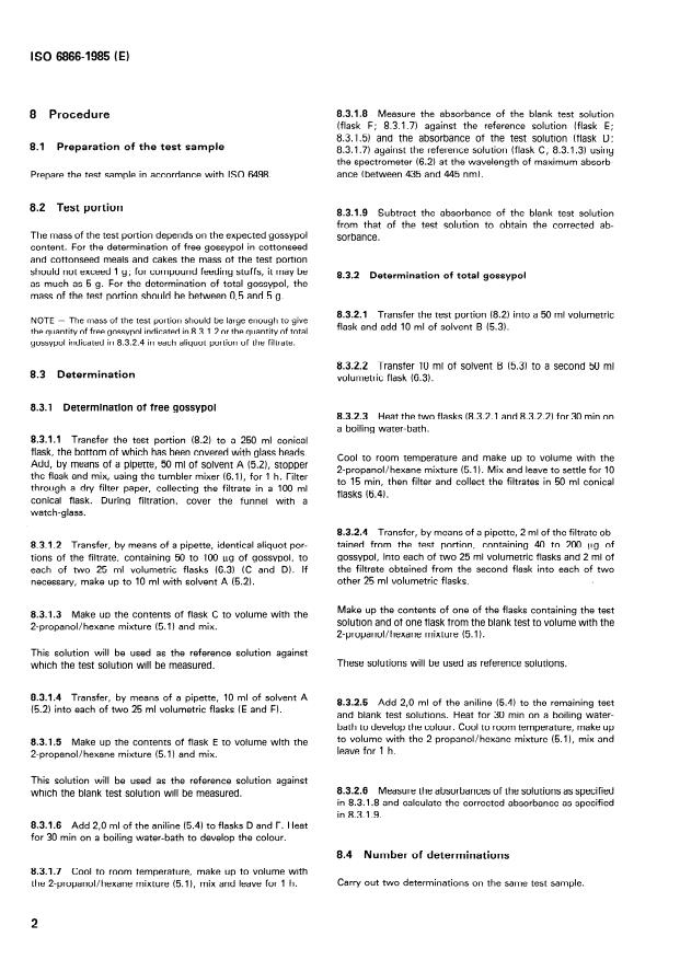 ISO 6866:1985 is a standard published by the International Organization for Standardization (ISO). Its full title is "Animal feeding stuffs - Determination of free and total gossypol". This standard covers: The method is applicable to cottonseed and cottonseed meals and cakes. The method consists in extracting of the compound in the presence of 3-aminopropane-1-ol, either with a mexture of 2-propanol and hexane for the determination of free gossypol or with dimethylformamide for the determination of total gossypol. Conversion to gossypol-dianiline using aniline, and measurement of the absorbance at the wavelength of maximum absorbance (between 435 and 445 nm).