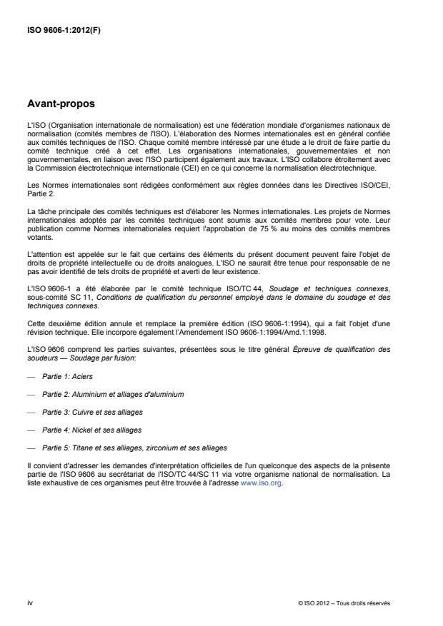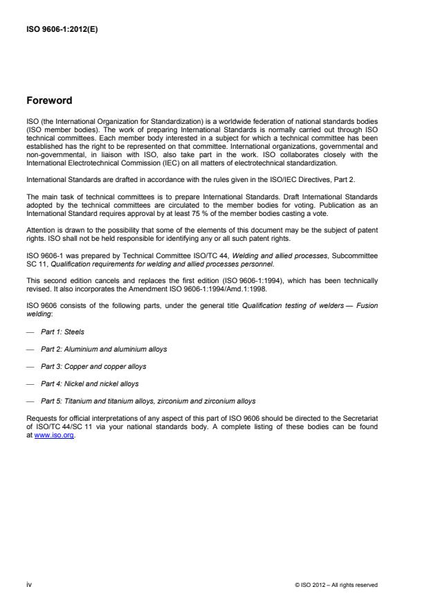 ISO 9606-1:2012 specifies the requirements for qualification testing of welders for fusion welding of steels. It provides a set of technical rules for a systematic qualification test of the welder, and enables such qualifications to be uniformly accepted independently of the type of product, location and examiner or examining body. When qualifying welders, the emphasis is placed on the welder's ability manually to manipulate the electrode, welding torch or welding blowpipe, thereby producing a weld of acceptable quality. The welding processes referred to in ISO 9606-1:2012 include those fusion-welding processes which are designated as manual or partly mechanized welding. It does not cover fully mechanized and automated welding processes.