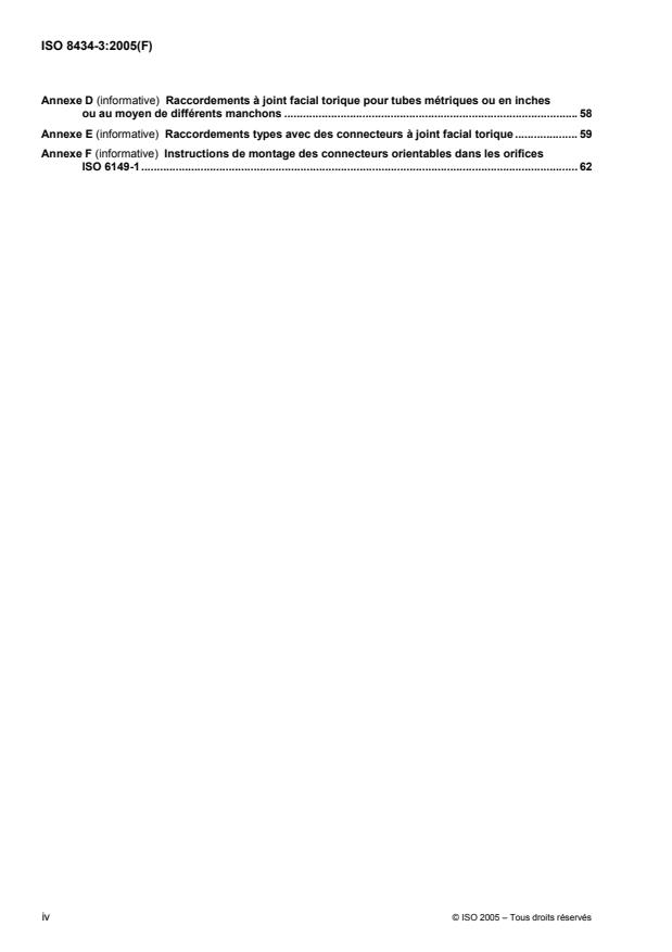 L'ISO 8434-3:2005 spécifie les exigences générales et dimensionnelles pour la conception et la performance des connecteurs à joints faciaux toriques réalisés en acier pour des diamètres extérieurs de tubes ou des diamètres intérieurs de tuyaux flexibles de 6 mm à 38 mm inclus. Ces connecteurs sont utilisés dans les transmissions hydrauliques et pneumatiques et les applications générales lorsque les joints d'étanchéité élastomères peuvent servir à empêcher les fuites de fluide, y compris les fuites causées par des modifications dans les procédures de montage. Ils sont prévus pour le raccordement de tubes et de tuyaux à des orifices conformes à l'ISO 6149-1. Ces connecteurs conviennent aux tubes métriques comme aux tubes en inches, il suffit de changer le manchon. Dans le passé, ces connecteurs ont surtout été utilisés avec des tubes en inches. Pour les nouvelles et futures conceptions, l'utilisation de tubes métriques est préférable. L'ISO 8434-3:2005 spécifie aussi un essai de performance et de qualification pour les connecteurs à joints faciaux toriques.