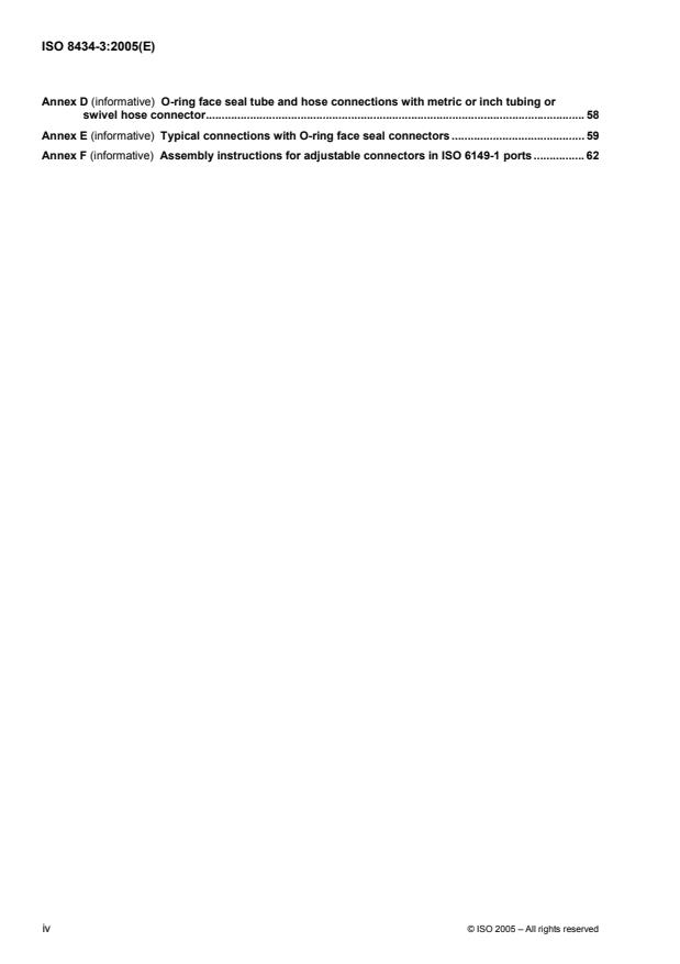 ISO 8434-3:2005 - "Metallic tube connections for fluid power and general use - Part 3: O-ring face seal connectors" defines the general and dimensional requirements, materials, performance and qualification testing for O‑ring face seal connectors made of steel for tube outside diameters or hose inside diameters from 6 mm to 38 mm inclusive. These connectors are intended for fluid power and general applications where elastomeric O‑rings prevent leakage, and for making connections to ports in accordance with ISO 6149-1. Both inch and metric tubing can be used (by changing the sleeve), although metric tubing is recommended for new designs.