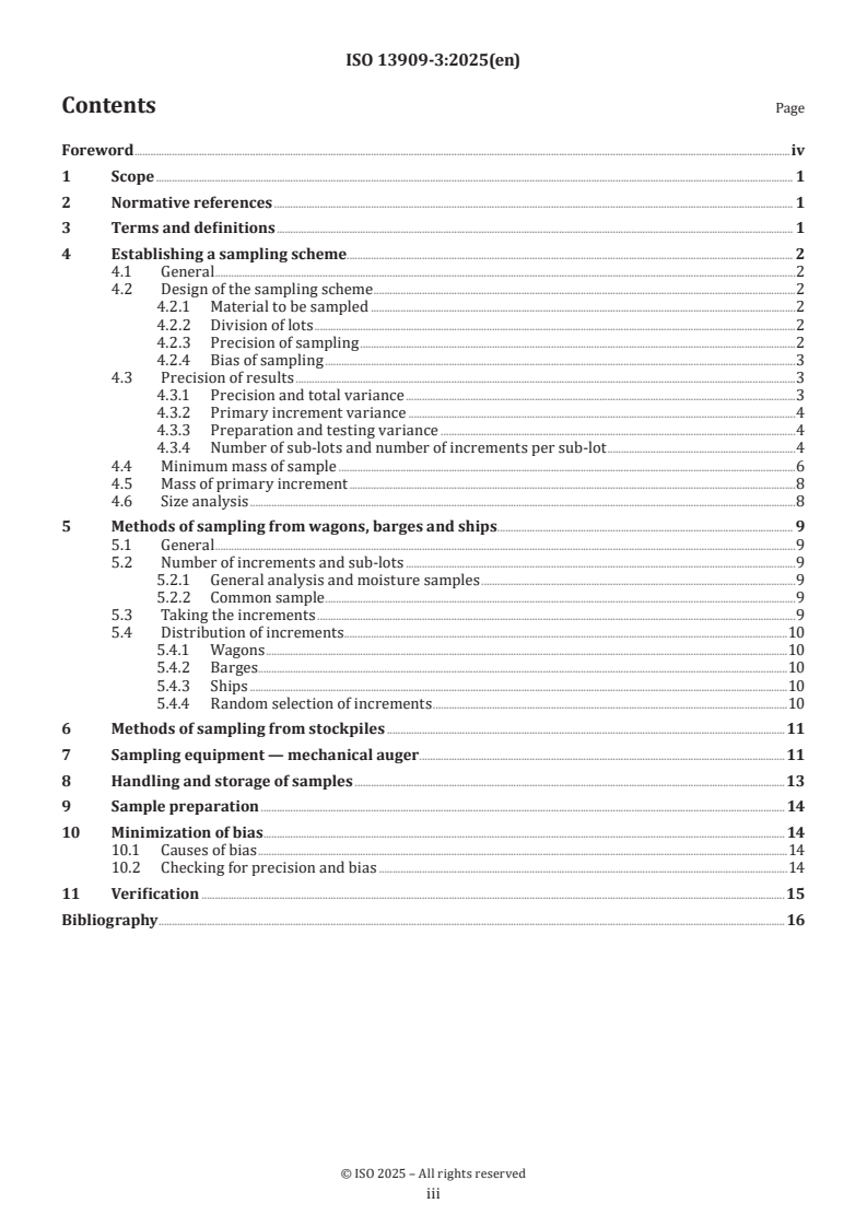 Keywords: ISO 13909-3:2025, mechanical sampling coal, sampling of coal from stationary lots, wagons barges ships stockpiles, sampling scheme, sampling bias, moisture determination, primary increment.