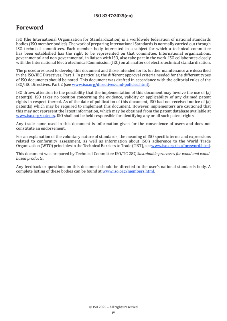 ISO 8347:2025 is a standard published by the International Organization for Standardization (ISO). Its full title is "Measurement procedures associated with the chain of custody in native tropical forest management areas". This standard covers: This document establishes a process to measure wood being logged in native tropical forest management areas following an approved and documented plan. Such a process includes quantifying and monitoring the harvested area to support the chain of custody assessment, helping to ensure the origin of the logged wood. Wood volume measurement is outside the scope of this document. This document proposes indicators that can be used to reinforce the level of confidence with regards to the correct origin of the logged wood, particularly when assessing the transport and commercial documentation of wood-based products, by means of a consistency check with what can be observed as occurring in the forest area declared as the origin of native tropical timber. The indicators will serve as an alert of any eventual inconsistency detected. These indicators are obtained by means of standardized metrics. These metrics are mathematical models that establish a correlation between the area of subtracted vegetation – detected through remote sensing monitoring tools – and the number of extracted trees that generate the amount of declared logged wood. This document is intended to be used to quantify the impact resulting from native vegetation extraction by selective logging in various tropical forest regions of the world, in order to support the long-term maintenance of these forest assets. The scope of this document is limited to native tropical forests, i.e. forests naturally originated and formed by native species (or group) in tropical regions. This document does not apply to planted forests, regardless of the species (or group) being native or exotic, as those forests are subject to varied and particular management practices which depend on the geographical conditions and rules of the country in which they are located. Regarding the limitations of this document, it is not intended to ensure: — exact origin (geographical coordinates) of each log; — exact volumes of wood extracted from the forest; — species (or group) of wood harvested; — chain of custody compliance; — social and labour compliance of the audited operation; — tax compliance of the audited operation. This document does not focus on, and is not oriented towards, biomass and carbon-balance estimations. This document does not cover any aspects of sustainable forest management and focuses on measurement procedures described above. In addition, it is not intended to be a Management Systems Standard (MSS). Furthermore, the national legal requirements and international policies are not repeated in this document, including those related to sustainability aspects, as well as those related to traditional and indigenous communities contained in the principles/articles of the UN Declaration on the rights of Indigenous Peoples (UNDRIP).