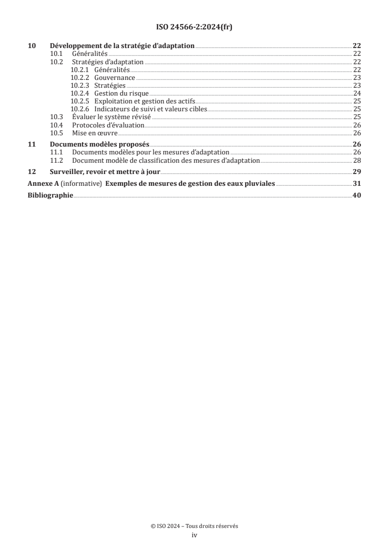Le présent document donne des recommandations relatives à l’identification et à l’évaluation des impacts du changement climatique sur les systèmes de gestion des eaux pluviales et au développement de stratégies d’adaptation à ces impacts. L’évaluation des impacts repose sur les principes d’évaluation décrits dans l’ISO 24566-1. Le présent document fournit également des exemples d’impacts du changement climatique sur les systèmes de gestion des eaux pluviales et de mesures mises en œuvre par les services municipaux de l’eau ou par la juridiction compétente (par exemple, municipalité ou région desservie par le service). Les exemples de mesures illustrent les stratégies d’adaptation qui ont été appliquées. NOTE Les systèmes d’assainissement unitaires sont couverts par le présent document en ce qui concerne les activités de collecte, de transport, de stockage et de traitement des eaux pluviales. Les systèmes d’assainissement d’eaux usées séparatifs sont couverts par l’ISO 24566-4.