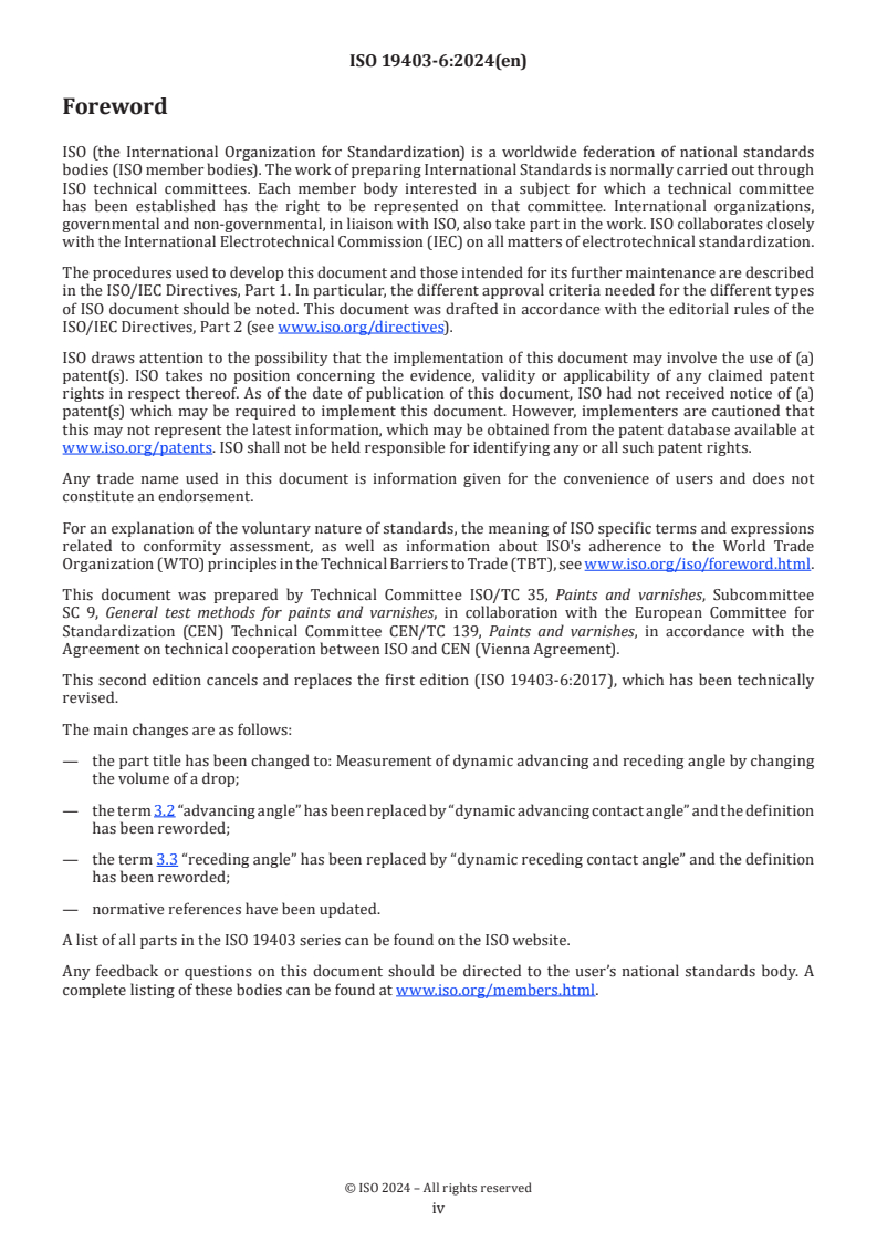ISO 19403-6:2024 - Paints and varnishes — Wettability — Part 6: Measurement of dynamic advancing and receding angle by changing the volume of a drop Released:18. 10. 2024