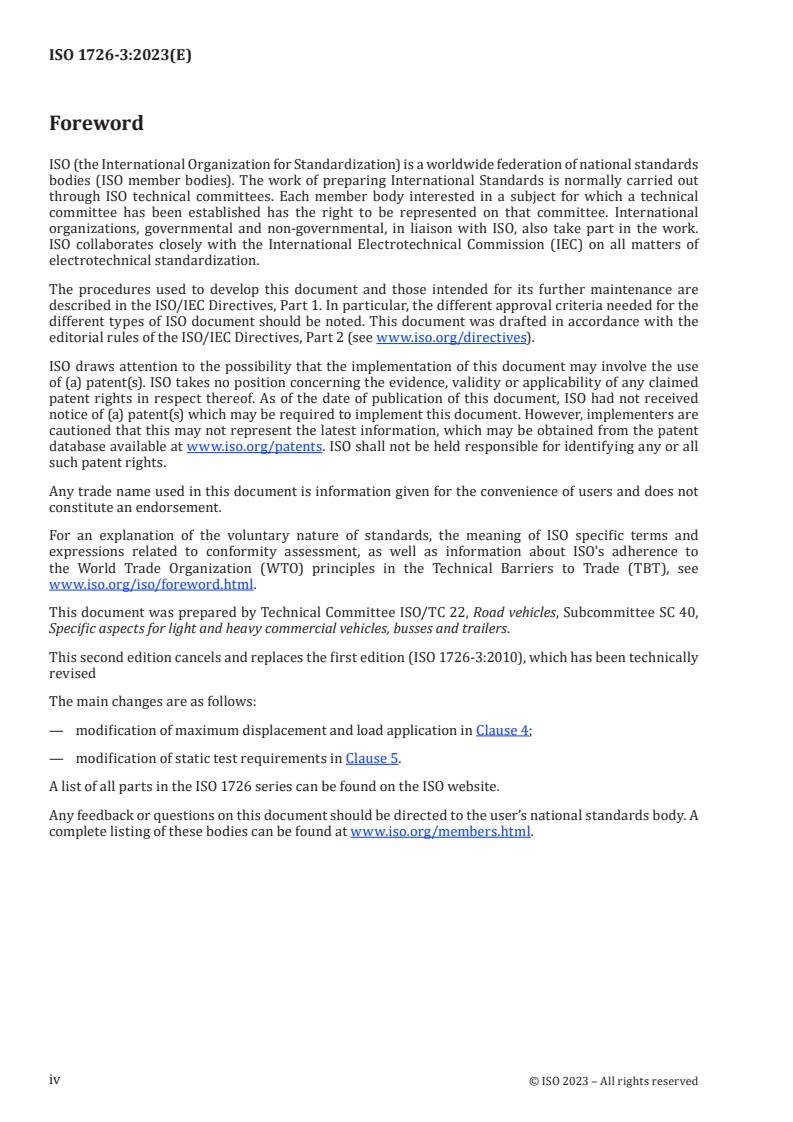 ISO 1726-3:2023 specifies requirements and test methods for the semi‑trailer contact area to the fifth wheel. The standard defines static test conditions and acceptance criteria to ensure semi‑trailers are compatible with a wide variety of tractor vehicles fitted with fifth wheel couplings in accordance with ISO 3842. Its purpose is to prevent damage or malfunction of the fifth wheel caused by the semi‑trailer chassis, plate or related components.