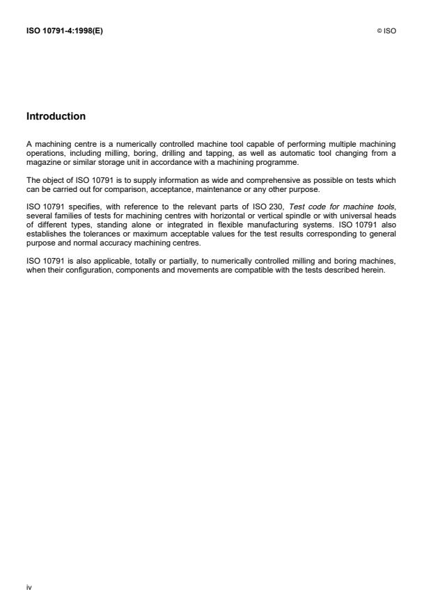 Keywords: ISO 10791-4, machining centre, positioning accuracy, repeatability, linear axes, rotary axes, CNC, laser interferometer, autocollimator, ISO 230-2.