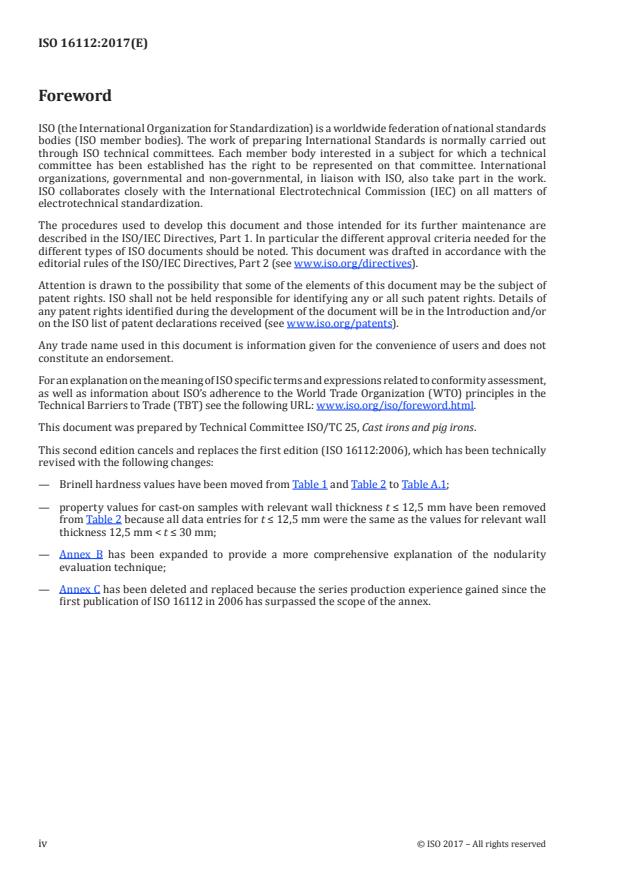 - Five material grades (ISO 16112/JV/300/S through ISO 16112/JV/500/S) are defined by minimum tensile properties. Example minimum values for test pieces from separately cast samples: