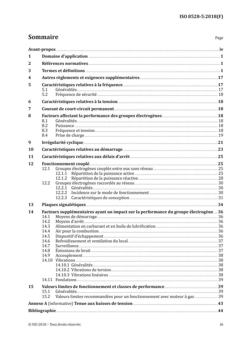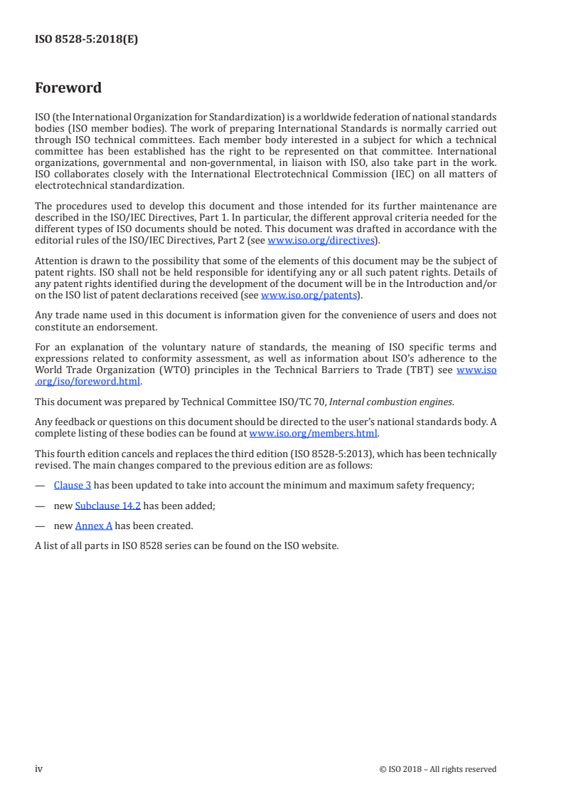 ISO 8528-5:2018 is a standard published by the International Organization for Standardization (ISO). Its full title is "Reciprocating internal combustion engine driven alternating current generating sets - Part 5: Generating sets". This standard covers: This document specifies design and performance criteria arising out of the combination of a reciprocating internal combustion (RIC) engine and an alternating current (a.c.) generator when operating as a unit. This unit can run paralleling or not to the grid. It applies to a.c. generating sets driven by RIC engines for land and marine use, excluding generating sets used on aircraft or to propel land vehicles and locomotives. For some specific applications (e.g. essential hospital supplies and high-rise buildings), supplementary requirements can be necessary. The provisions of this document are a basis for establishing any supplementary requirements. For generating sets driven by other reciprocating-type prime movers (e.g. steam engines), the provisions of this document can be used as a basis for establishing these requirements.