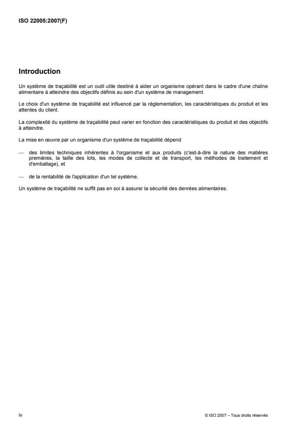 L'ISO 22005:2007 fixe les principes et spécifie les exigences fondamentales s'appliquant à la conception et à la mise en oeuvre d'un système de traçabilité de la chaîne alimentaire. Ce système peut être appliqué par un organisme opérant à un niveau quelconque de la chaîne alimentaire. Il est conçu pour être suffisamment flexible pour permettre aux organismes appartenant à la chaîne alimentaire d'atteindre des objectifs identifiés. Le système de traçabilité est un outil technique destiné à aider un organisme à se conformer à ses objectifs définis, et il peut être utilisé, si nécessaire, pour déterminer l'historique ou la localisation d'un produit ou de ses composants.
