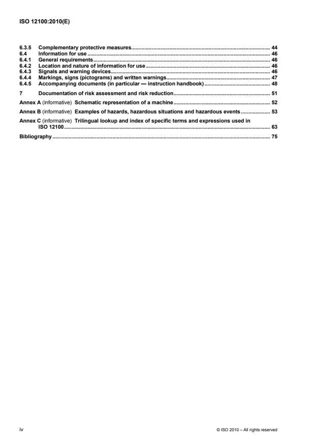 - Information for use and documentation: Requirements for signals, markings, instruction handbooks and verification/documentation of the risk assessment and risk reduction process (Clauses 6.4 and 7).