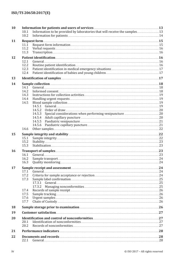 ISO/TS 20658:2017 is a technical specification published by the International Organization for Standardization (ISO). Its full title is "Medical laboratories - Requirements for collection, transport, receipt, and handling of samples". This standard covers: ISO/TS 20658:2017 specifies requirements and good practice recommendations for the collection, transport, receipt and handling of samples intended for medical laboratory examinations. ISO/TS 20658:2017 is applicable to medical laboratories and other medical services involved in laboratory pre-examination processes that include the examination request, patient preparation and identification, sample collection, transport, receipt and storage. It may also be applicable to some biobanks. ISO/TS 20658:2017 does not apply to blood and blood products intended for transfusion.